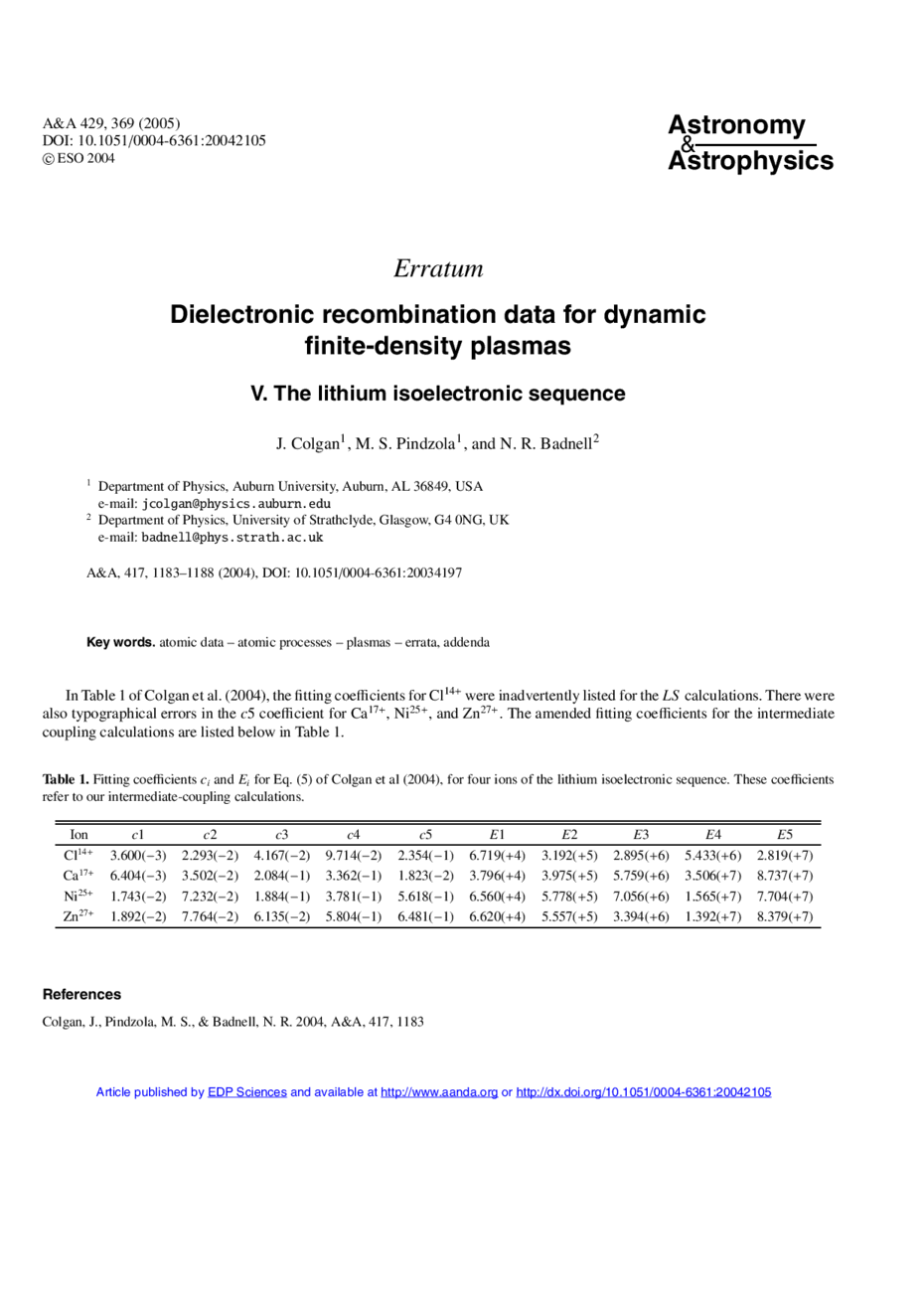 Key words: atomic data / atomic processes / plasmas / errata, addenda