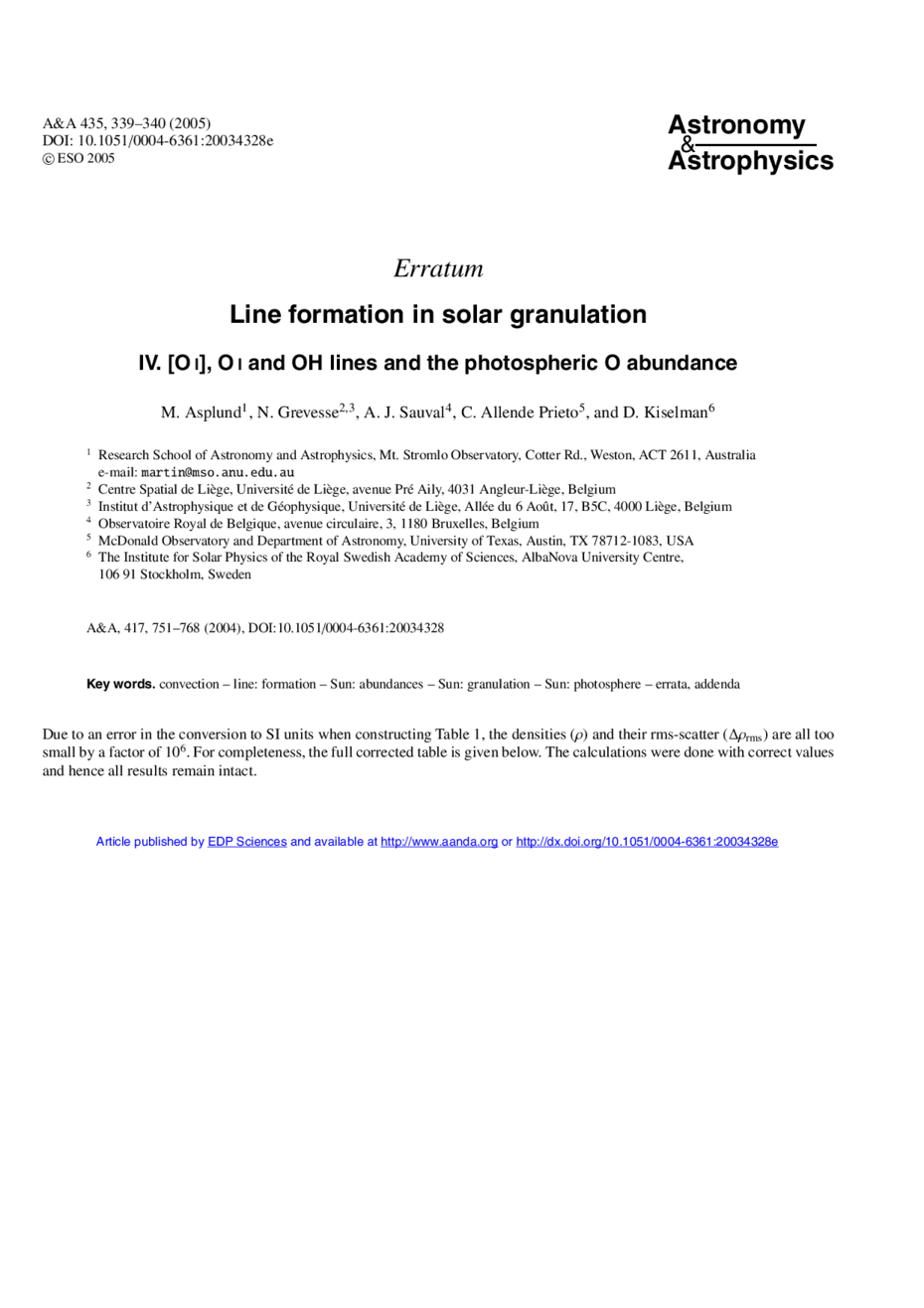 Key words: convection / line: formation / Sun: abundances / Sun: granulation / Sun: photosphere / errata, addenda