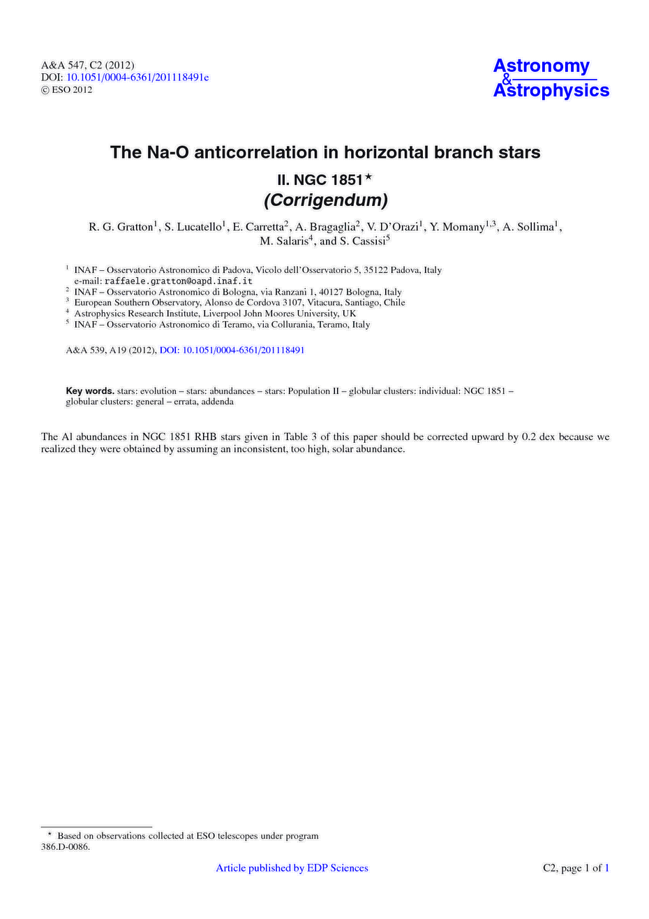 Key words: stars: evolution / stars: abundances / stars: Population II / globular clusters: individual: NGC 1851 / globular clusters: general / errata, addenda