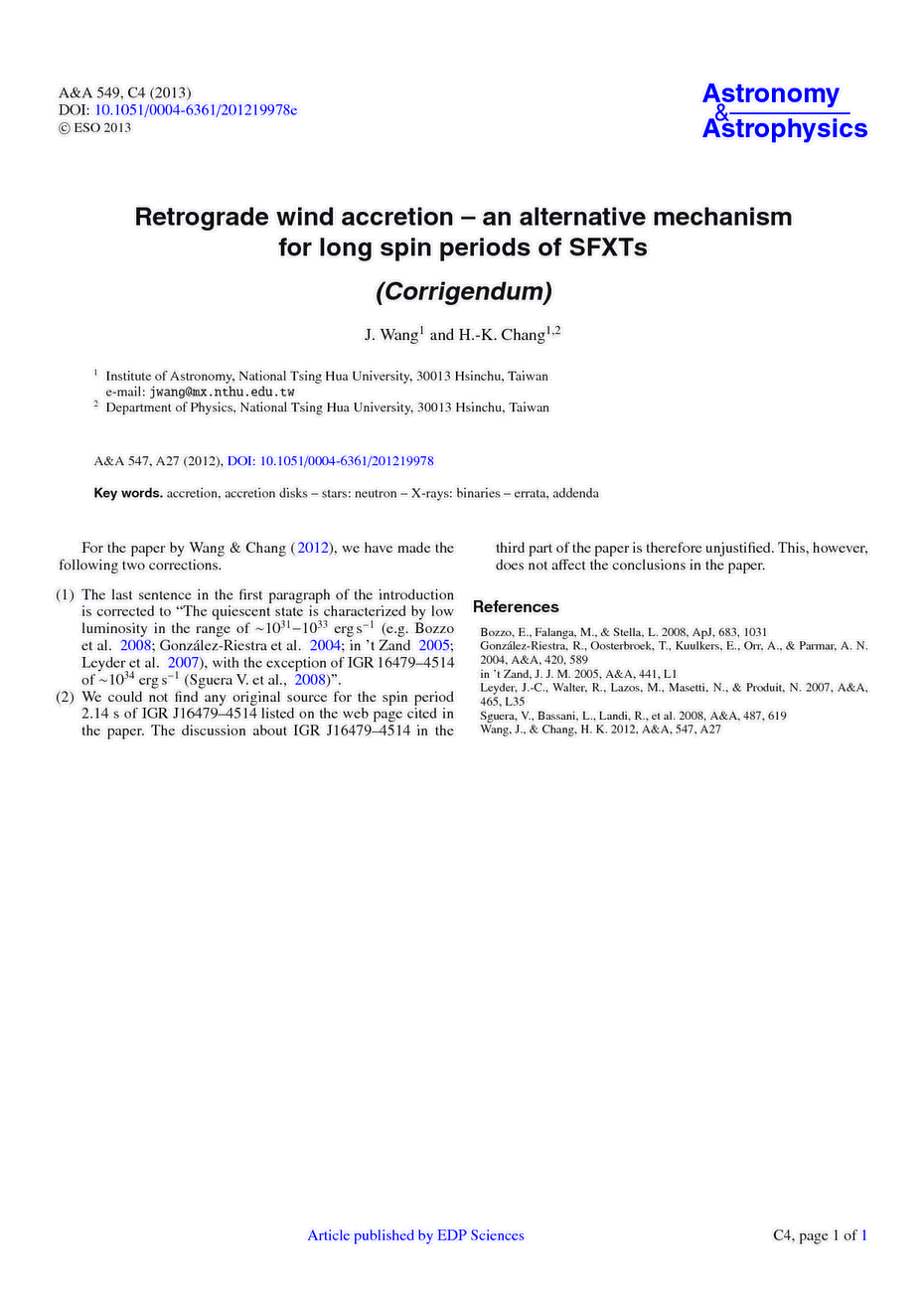 Retrograde wind accretion – an alternative mechanism for long spin periods of SFXTs (Corrigendum)
