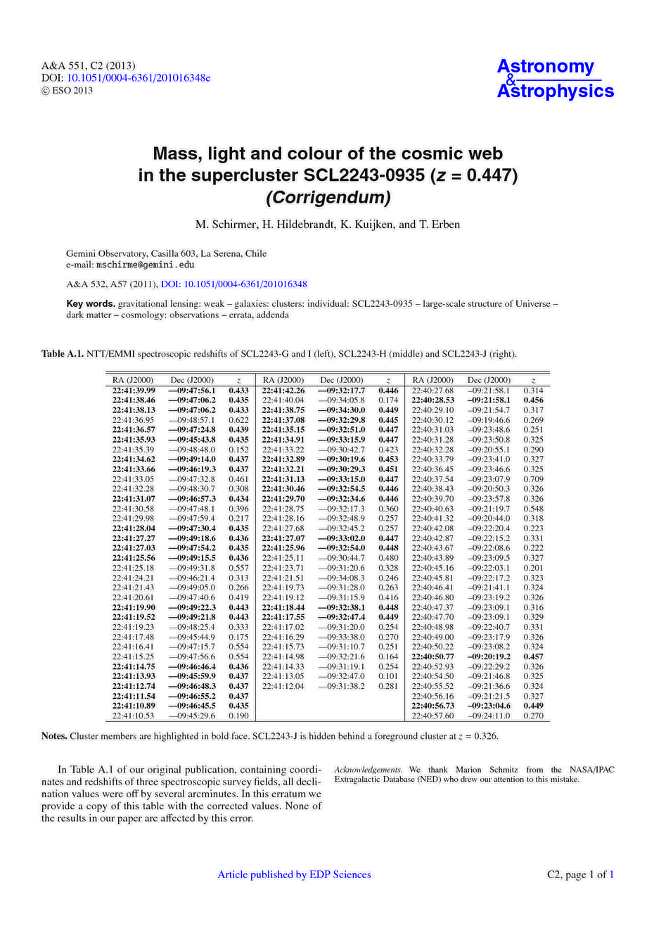 Key words: gravitational lensing: weak / galaxies: clusters: individual: SCL2243-0935 / large-scale structure of Universe / dark matter / cosmology: observations / errata, addenda