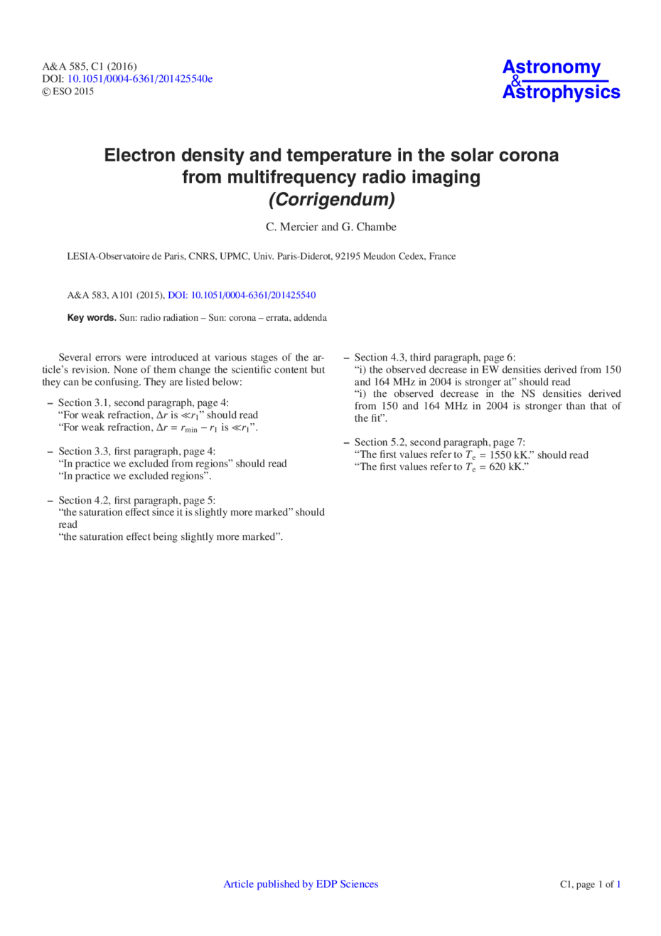 Key words: Sun: radio radiation / Sun: corona / errata, addenda