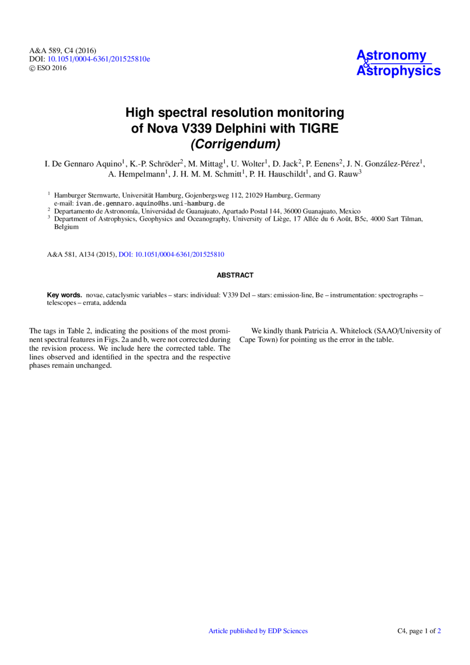 Key words: novae, cataclysmic variables / stars: individual: V339 Del / stars: emission-line, Be / instrumentation: spectrographs / telescopes / errata, addenda
