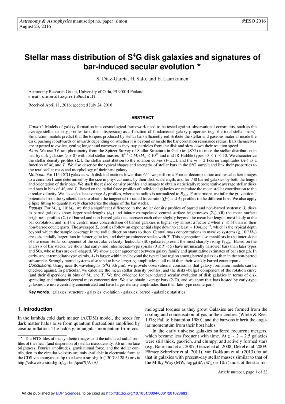 Results. For M∗ ≥ 109M⊙, we find a significant difference in the stellar density profiles of barred and non-barred systems: (i) disks in barred galaxies show larger scalelengths (hR) and fainter extrapolated central surface brightnesses (Σ°); (ii) the mean surface brightness profiles (Σ∗) of barred and non-barred galaxies intersect each other slightly beyond the mean bar length, most likely at the bar corotation; and (iii) the central mass concentration of barred galaxies is higher (by almost a factor 2 when T ≤ 5) than in their non-barred counterparts. The averaged Σ∗ profiles follow an exponential slope down to at least ~10 M⊙ pc-2, which is the typical depth beyond which the sample coverage in the radial direction starts to drop. Central mass concentrations in massive systems (≥1010M⊙) are substantially larger than in fainter galaxies, and their prominence scales with T. This segregation also manifests in the inner slope of the mean stellar component of the circular velocity: lenticular (S0) galaxies present the most sharply rising V3.6 μm. Based on the analysis of bar stacks, we show that early- and intermediate-type spirals (0 ≤ T< 5) have intrinsically narrower bars than later types and S0s, whose bars are oval-shaped. We show a clear agreement between galaxy family and quantitative estimates of bar strength. In early- and intermediate-type spirals, A2 is larger within and beyond the typical bar region among barred galaxies than in the non-barred subsample. Strongly barred systems also tend to have larger A2 amplitudes at all radii than their weakly barred counterparts.