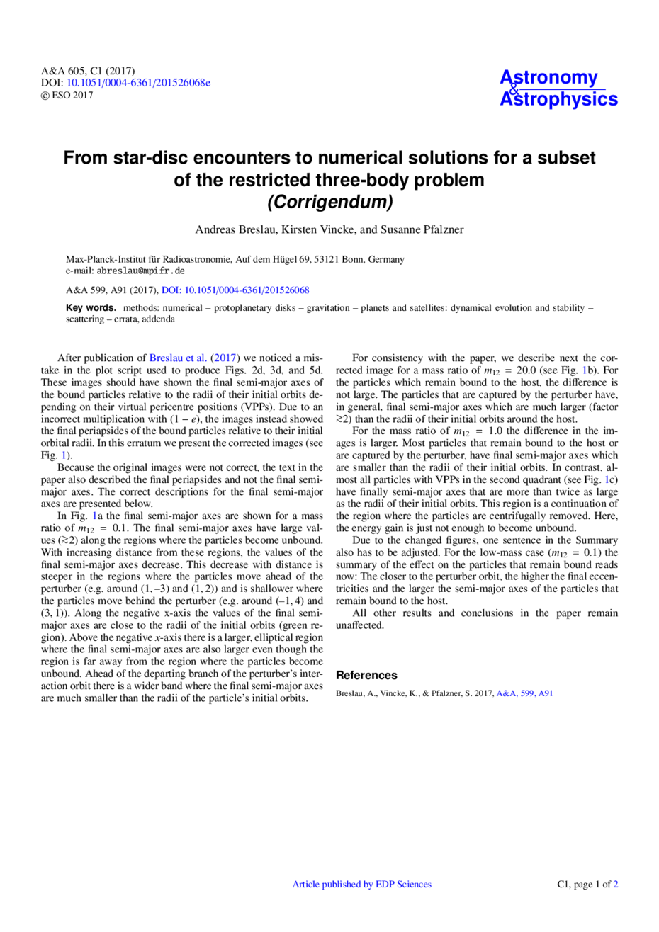 From star-disc encounters to numerical solutions for a subset of the restricted three-body problem (Corrigendum)
