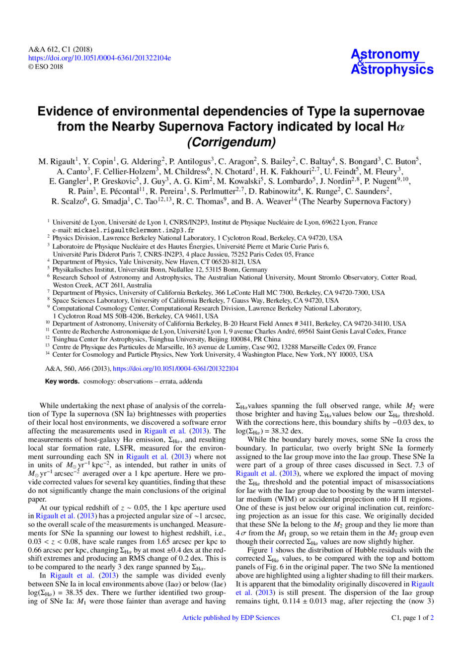 Evidence of environmental dependencies of Type Ia supernovae from the Nearby Supernova Factory indicated by local Hα (Corrigendum)