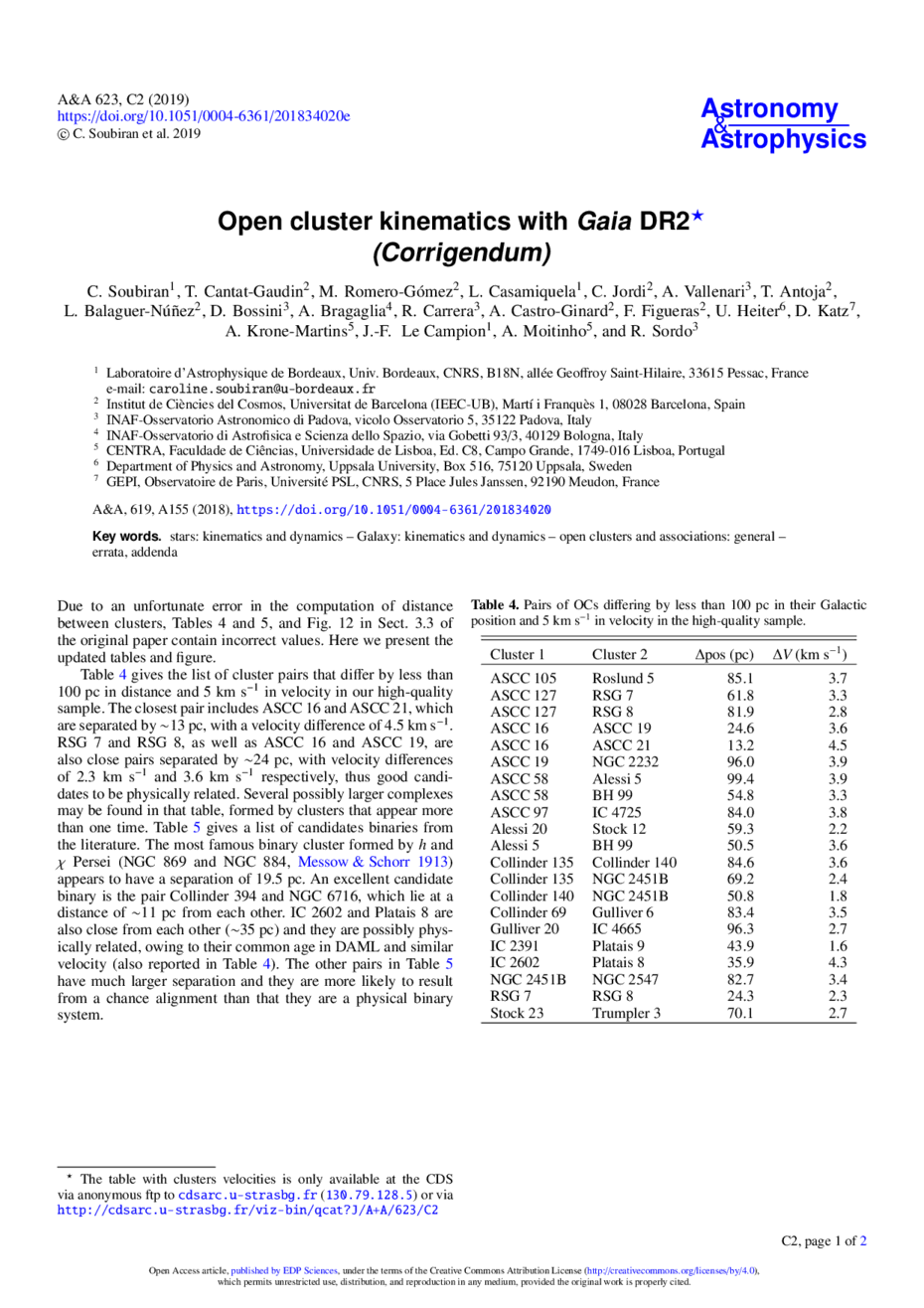 Key words: stars: kinematics and dynamics / Galaxy: kinematics and dynamics / open clusters and associations: general / errata, addenda