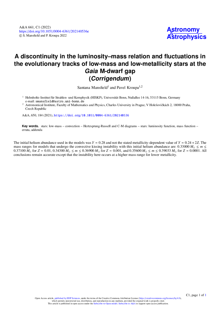 Key words: stars: low-mass / convection / Hertzsprung-Russell and C-M diagrams / stars: luminosity function, mass function / errata, addenda
