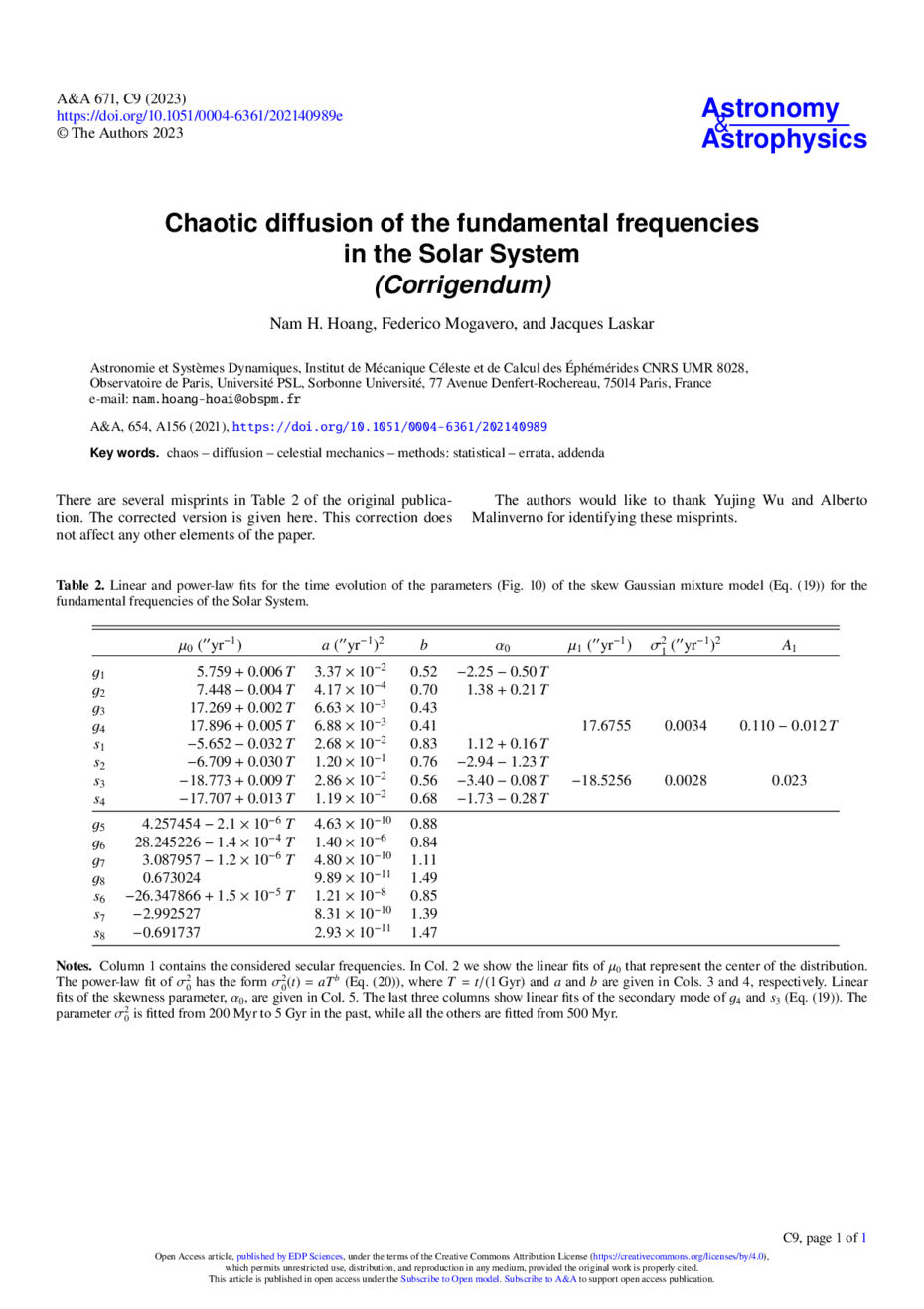Key words: chaos / diffusion / celestial mechanics / methods: statistical / errata, addenda