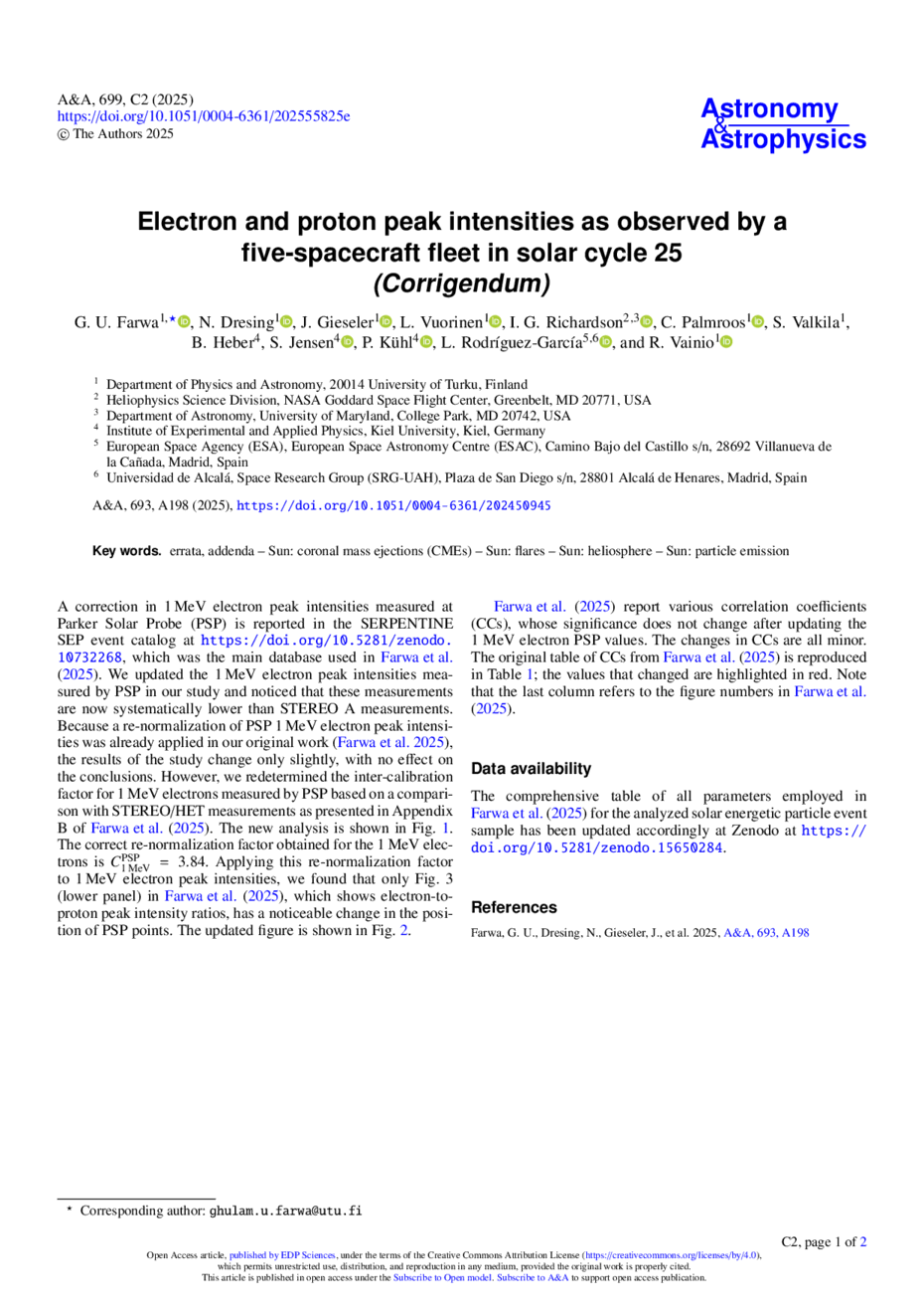 Electron and proton peak intensities as observed by a five-spacecraft fleet in solar cycle 25 (Corrigendum)