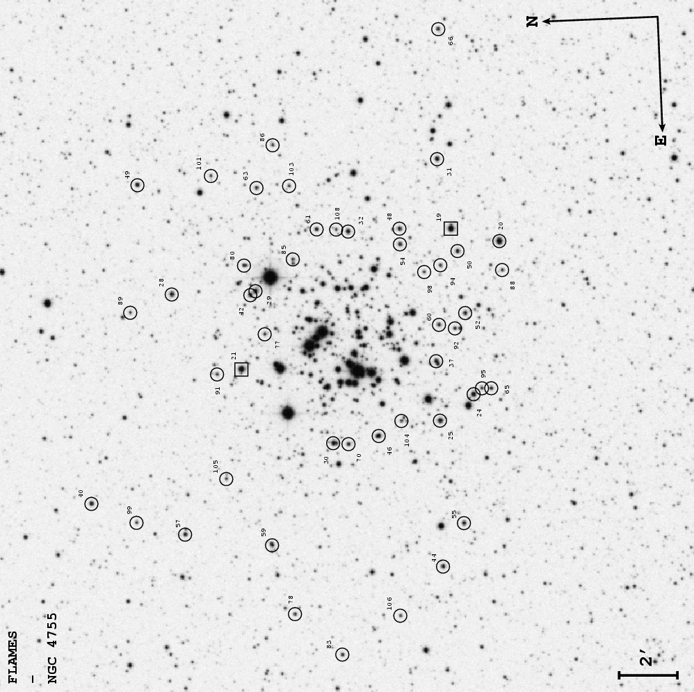Figure A.4: VLT-FLAMES targets (open circles) and FEROS targets (open squares) in the inner 7' of the NGC 4755 field. |