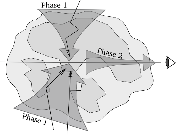 Figure 1: A schematic view of the creation of the observed surface brightness of scattered light (see text). The figure shows an inhomogeneous cloud with arrows indicating the flow of photons. In the first phase external radiation is transported onto a selected line of sight where it is scattered toward the observer. Photons reach this line possibly after several scatterings and preferably through regions of low density. In the second phase radiation propagates out from the cloud along the selected sightline. |