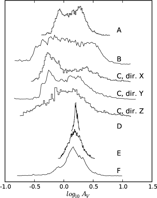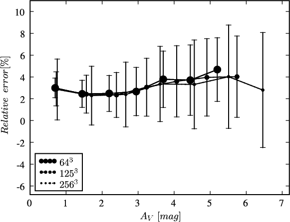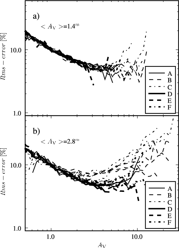 Figure 9: Rms-error of column density estimates as a function of the line-of-sight visual extinction. The plot includes results for all six model clouds, for three different directions of observation (X, Y, and D1). The frames correspond to the two values of average visual extinction. |
