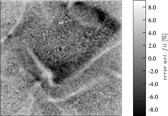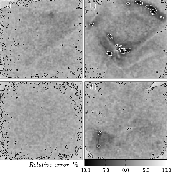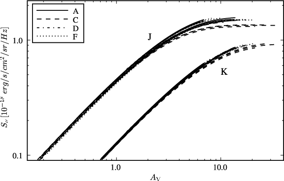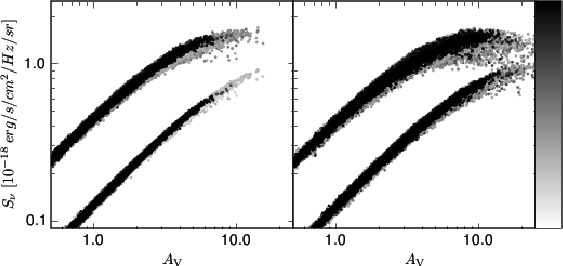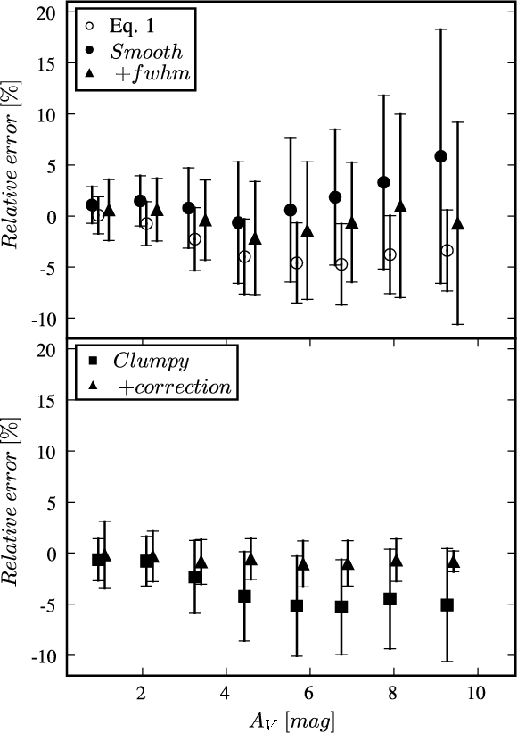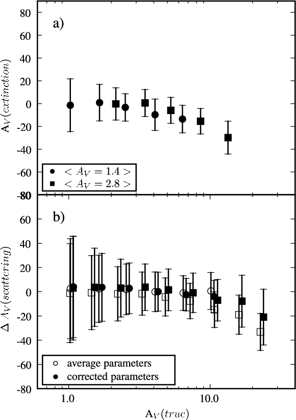 Figure 14: Upper frame: errors in the simulated extinction map. Plots are shown for two versions of model C, with average visual extinction 1.6 (circles) or 3.2 mag (squares). The resolution of the extinction map corresponds to a FWHM equal to seven map pixels. Lower frame: accuracy of the column density estimates based on NIR scattering. Results are shown for the two versions of the model C. The parameters are either the average values from all models (six clouds, three viewing directions and two scalings of average column density; open symbols) or were determined by correlating surface brightness against column densities estimated using the colour excess method (solid symbols). |