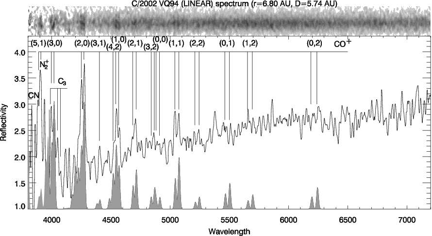 Figure 2: Observed spectrum and flux ratio plot comet/Sun for C/2002 VQ94 (LINEAR). Assigned molecular emissions are marked. Filled features at the bottom of the plot show the CO+ spectrum calculated under the Boltzmann approximation (Kim 1994, 1998). |