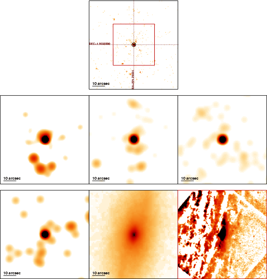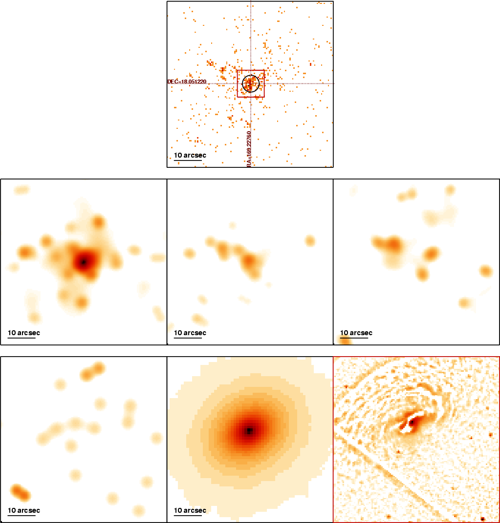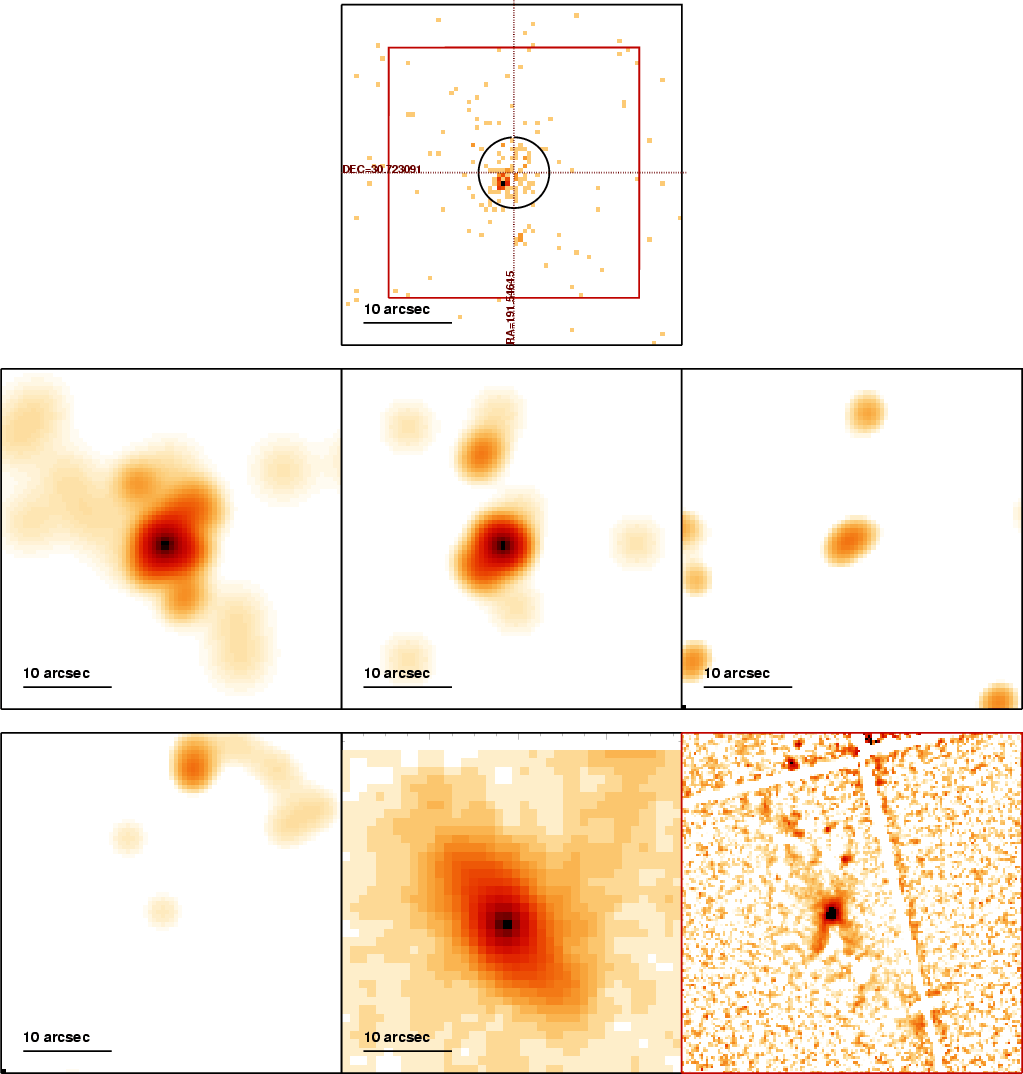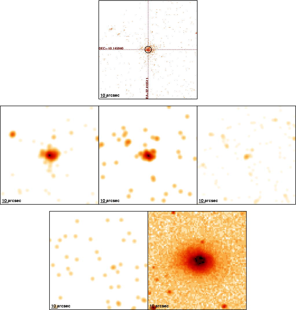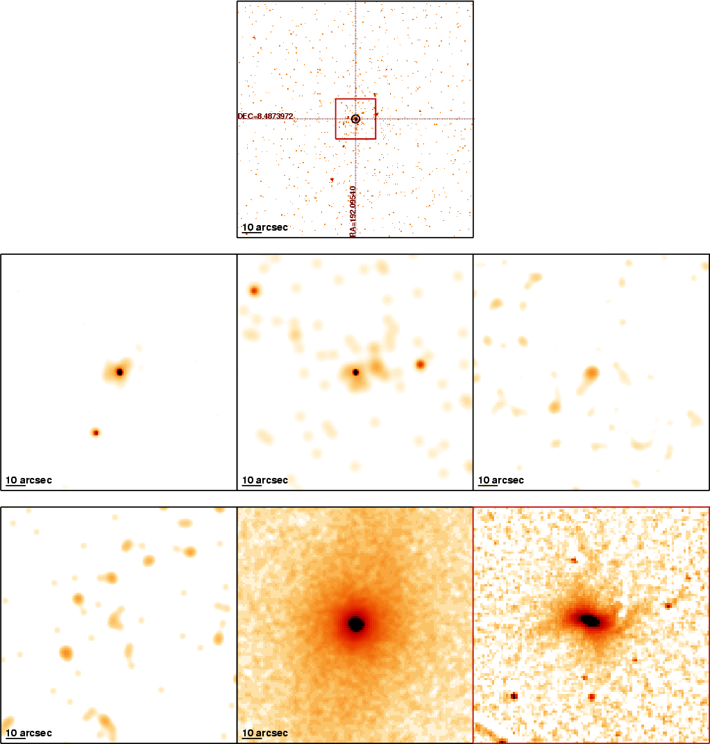 NGC 7130 (IC 5135). This galaxy shows a well-defined nuclear source at high X-ray energies (Fig. 5). Since most of the UV emission is spectrally characteristic of star formation (Thuan 1984; Gonzalez-Delgado et al. 1998), Levenson et al. (2005) tried to decompose the AGN and Starburst contributions and find that the AGN contribution manifested mainly at higher energies, higher than 3 keV. They find that the obscuration of the nucleus is Compton-thick, which prevents the detection of the intrinsic emission in the Chandra bandpass below 8 keV. We recall that our spectral fitting is not statistically acceptable for this source.