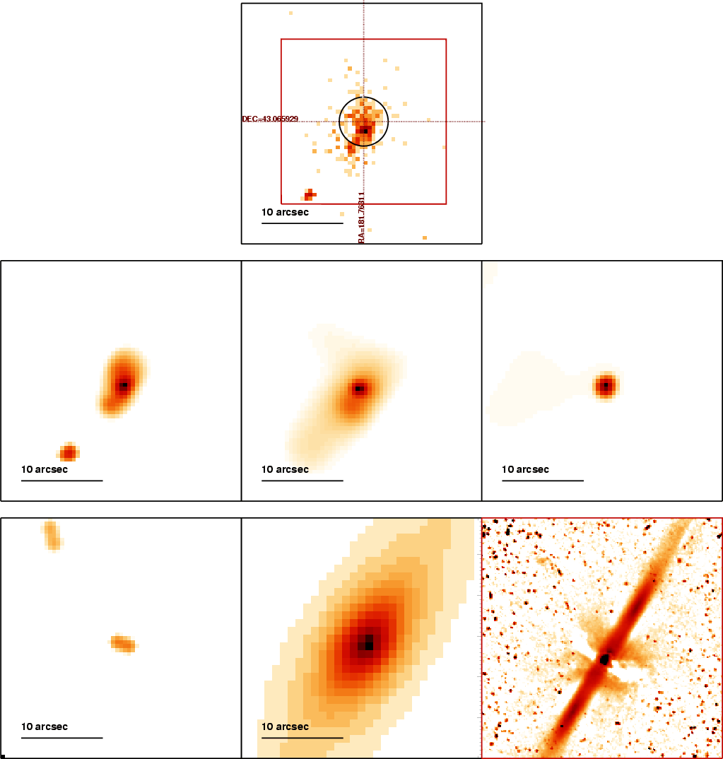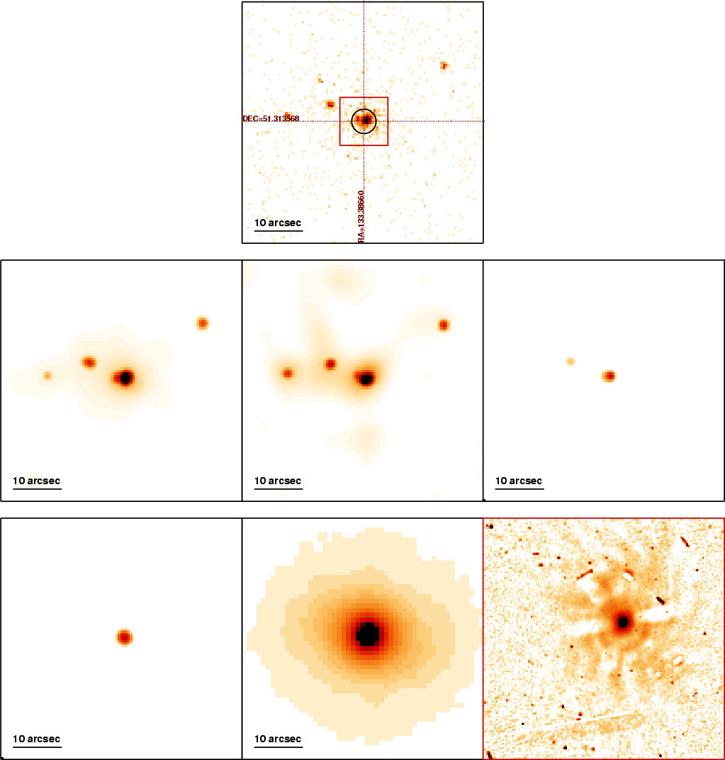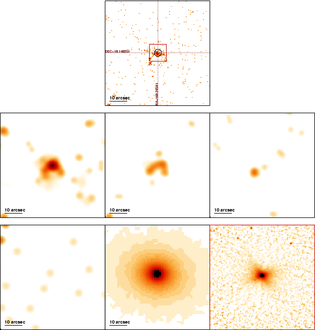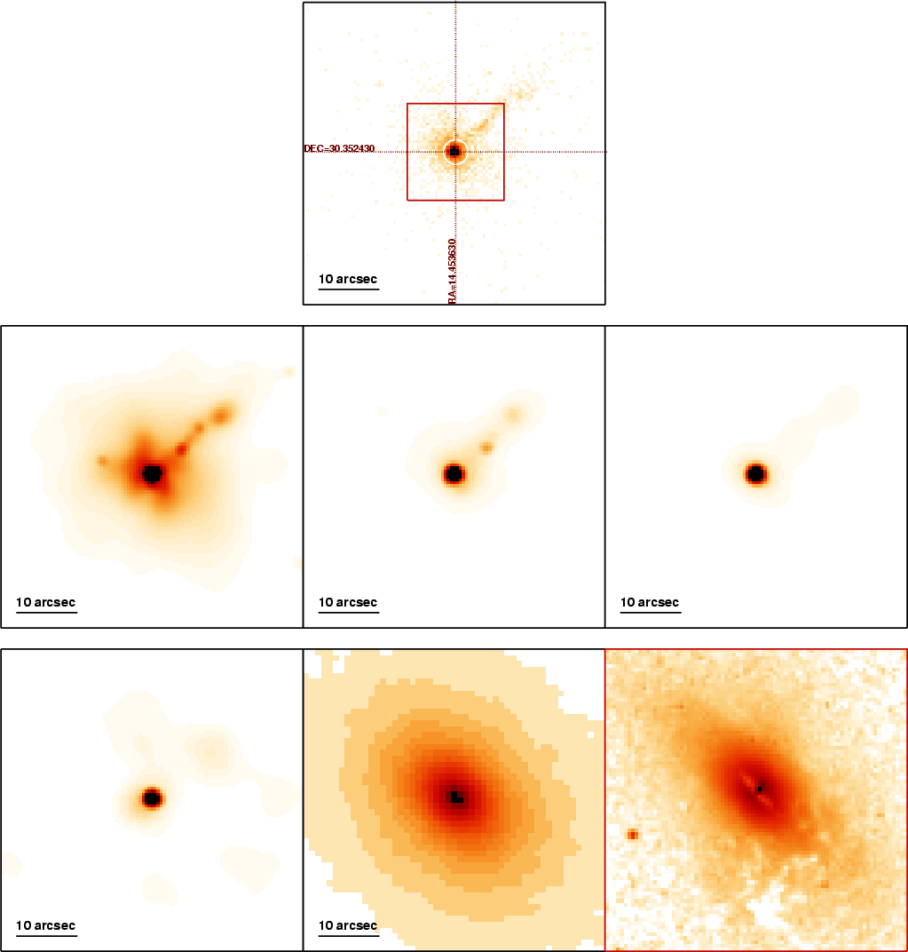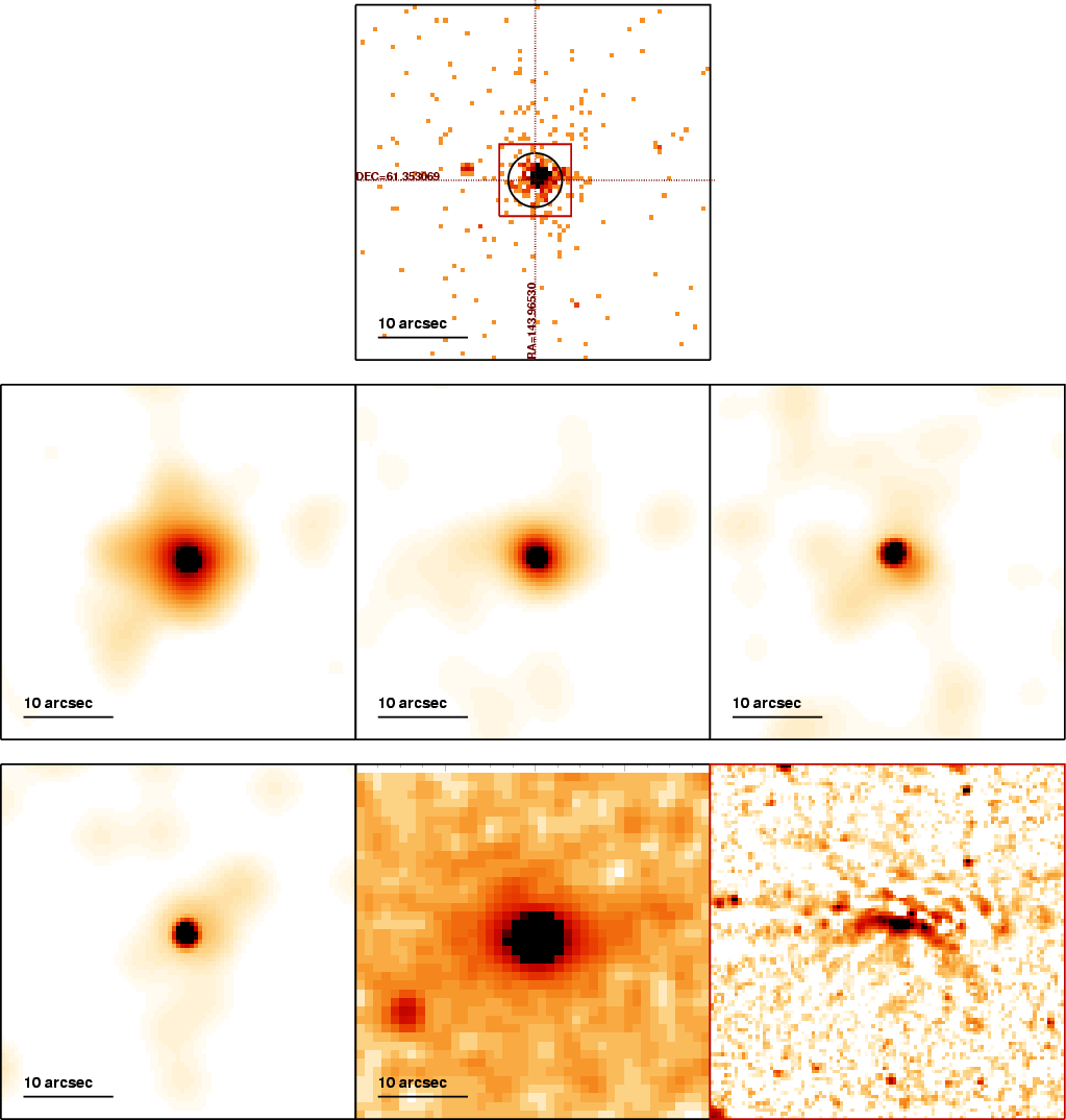 NGC 7130 (IC 5135). This galaxy shows a well-defined nuclear source at high X-ray energies (Fig. 5). Since most of the UV emission is spectrally characteristic of star formation (Thuan 1984; Gonzalez-Delgado et al. 1998), Levenson et al. (2005) tried to decompose the AGN and Starburst contributions and find that the AGN contribution manifested mainly at higher energies, higher than 3 keV. They find that the obscuration of the nucleus is Compton-thick, which prevents the detection of the intrinsic emission in the Chandra bandpass below 8 keV. We recall that our spectral fitting is not statistically acceptable for this source.