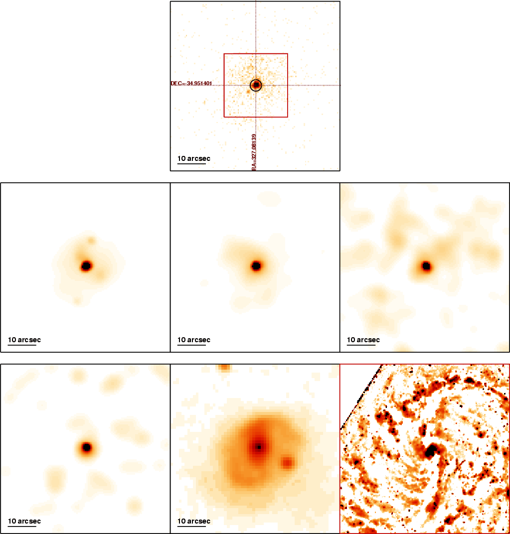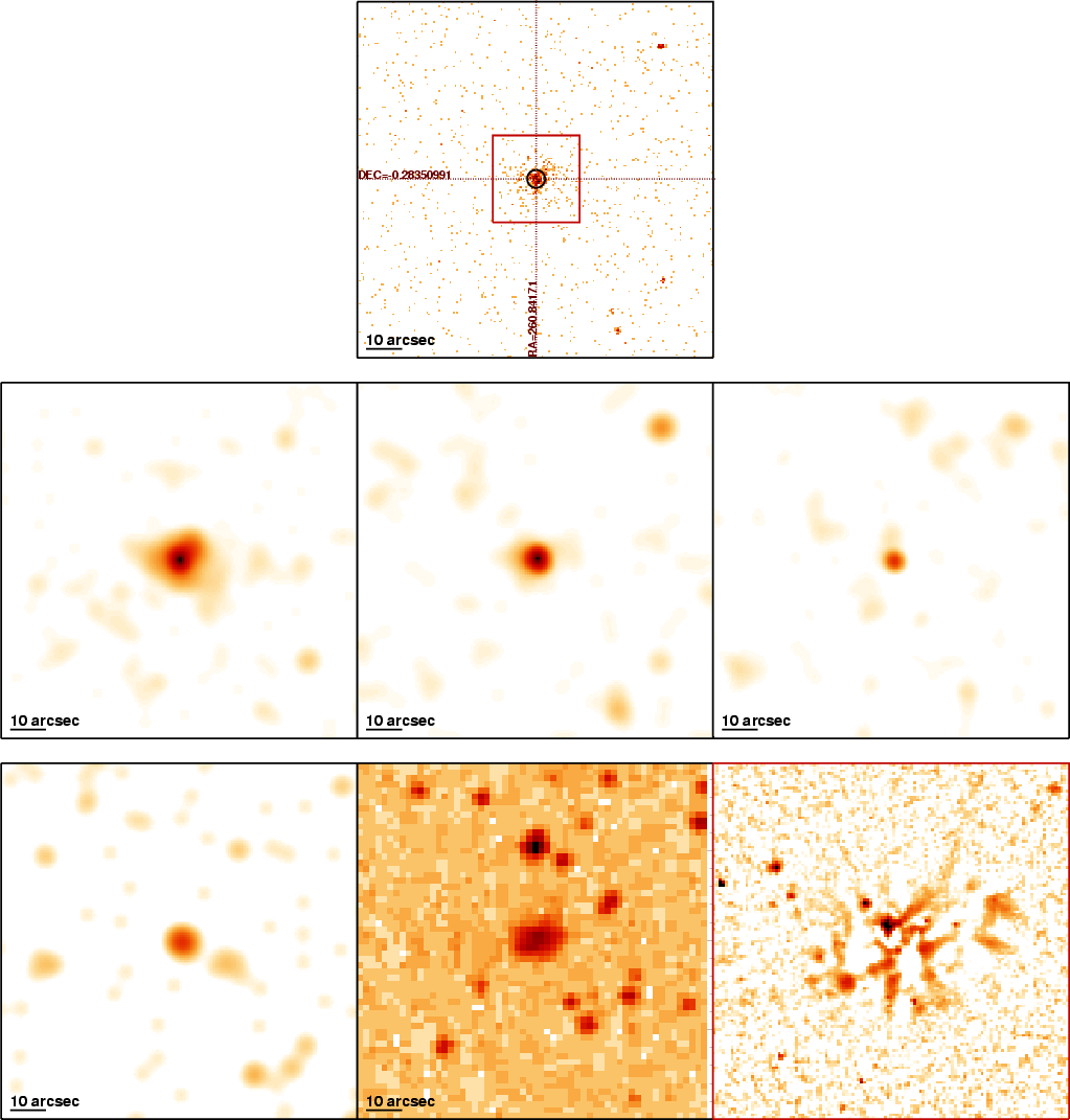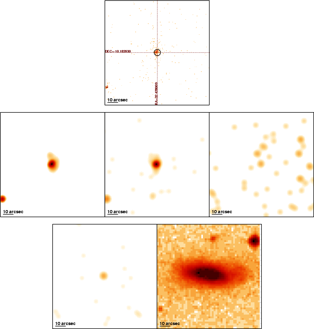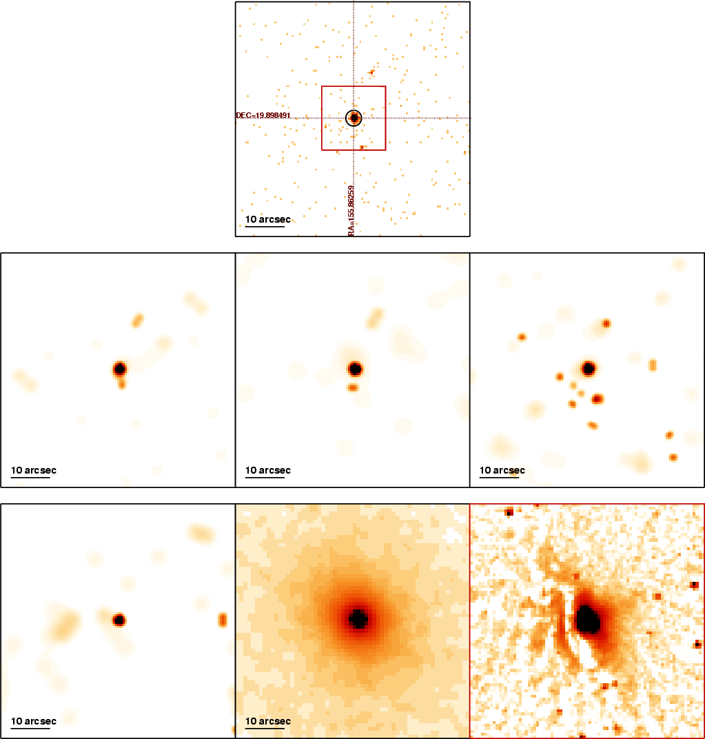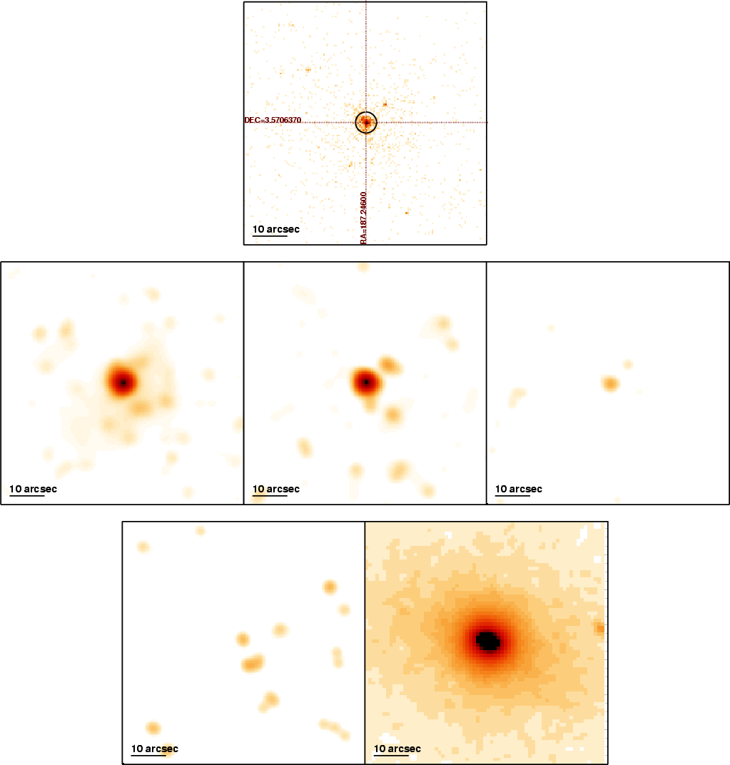 NGC 7130 (IC 5135). This galaxy shows a well-defined nuclear source at high X-ray energies (Fig. 5). Since most of the UV emission is spectrally characteristic of star formation (Thuan 1984; Gonzalez-Delgado et al. 1998), Levenson et al. (2005) tried to decompose the AGN and Starburst contributions and find that the AGN contribution manifested mainly at higher energies, higher than 3 keV. They find that the obscuration of the nucleus is Compton-thick, which prevents the detection of the intrinsic emission in the Chandra bandpass below 8 keV. We recall that our spectral fitting is not statistically acceptable for this source.