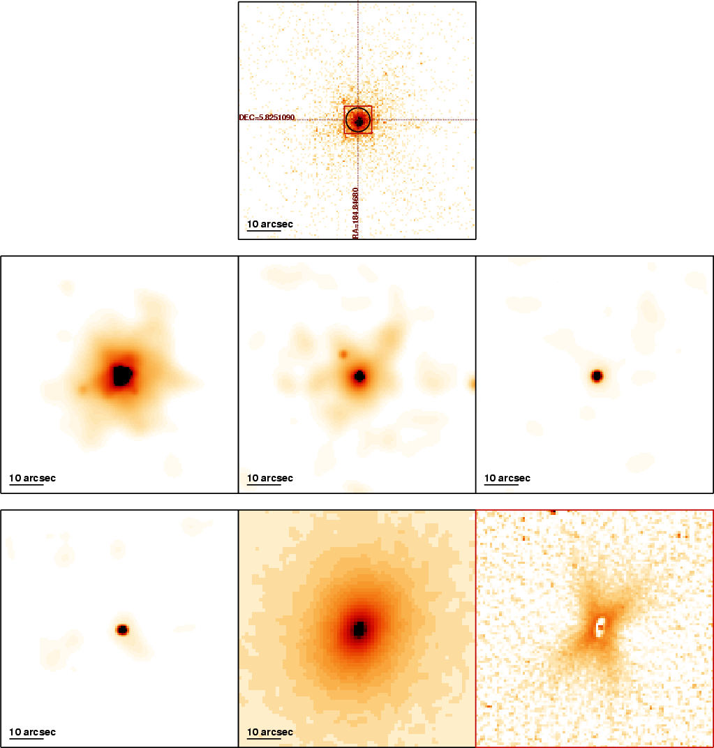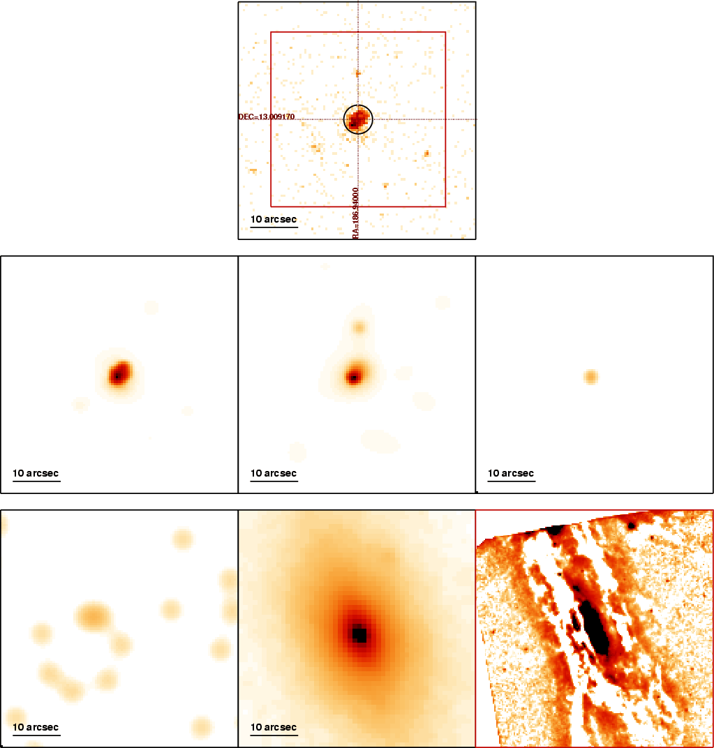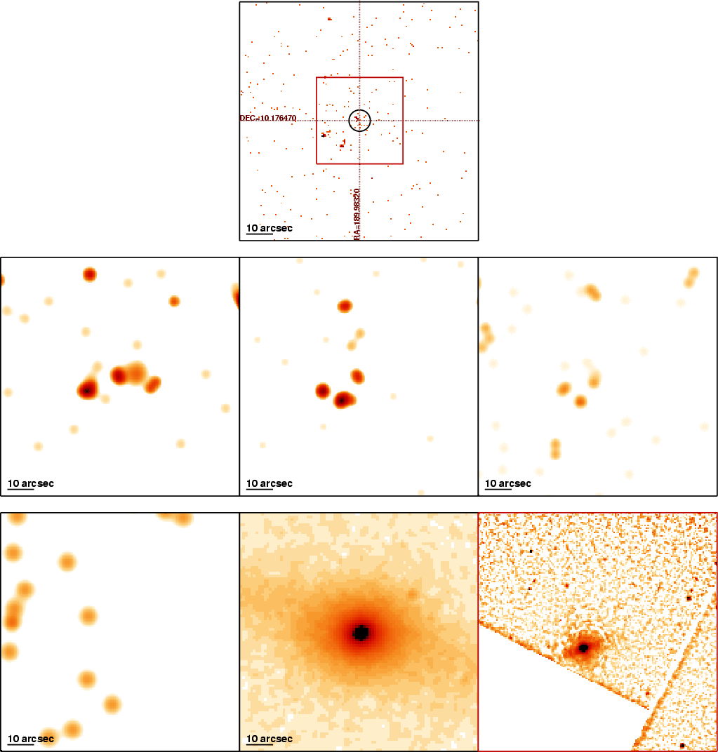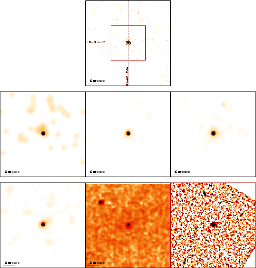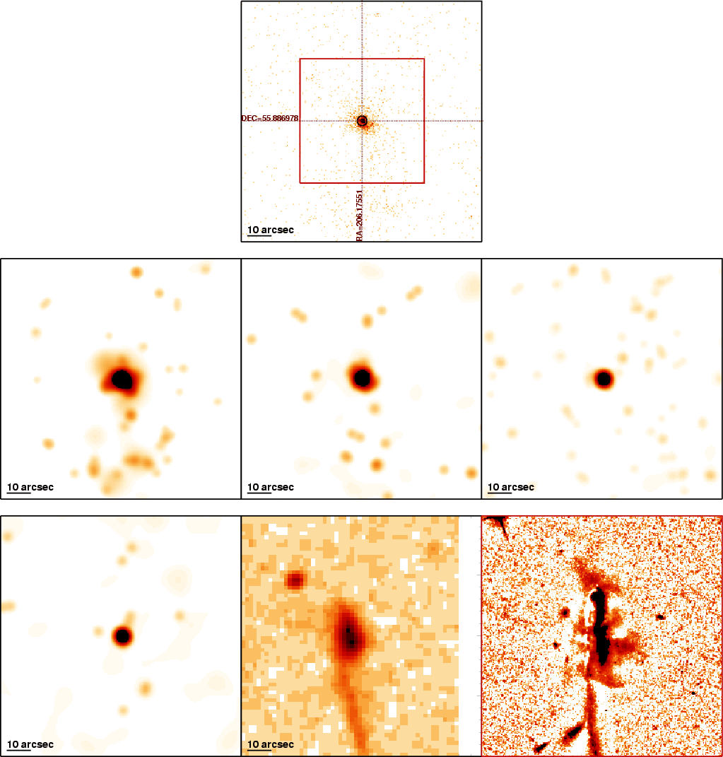 NGC 7130 (IC 5135). This galaxy shows a well-defined nuclear source at high X-ray energies (Fig. 5). Since most of the UV emission is spectrally characteristic of star formation (Thuan 1984; Gonzalez-Delgado et al. 1998), Levenson et al. (2005) tried to decompose the AGN and Starburst contributions and find that the AGN contribution manifested mainly at higher energies, higher than 3 keV. They find that the obscuration of the nucleus is Compton-thick, which prevents the detection of the intrinsic emission in the Chandra bandpass below 8 keV. We recall that our spectral fitting is not statistically acceptable for this source.