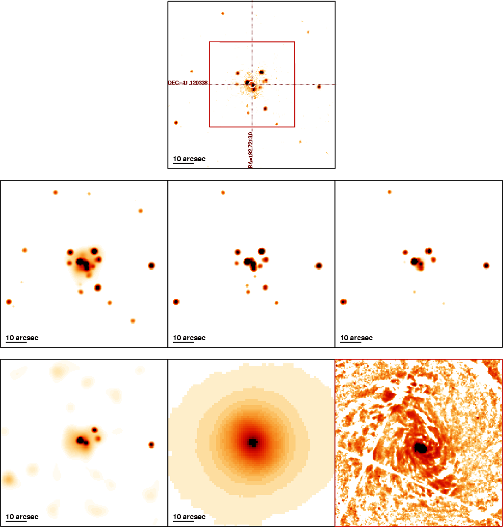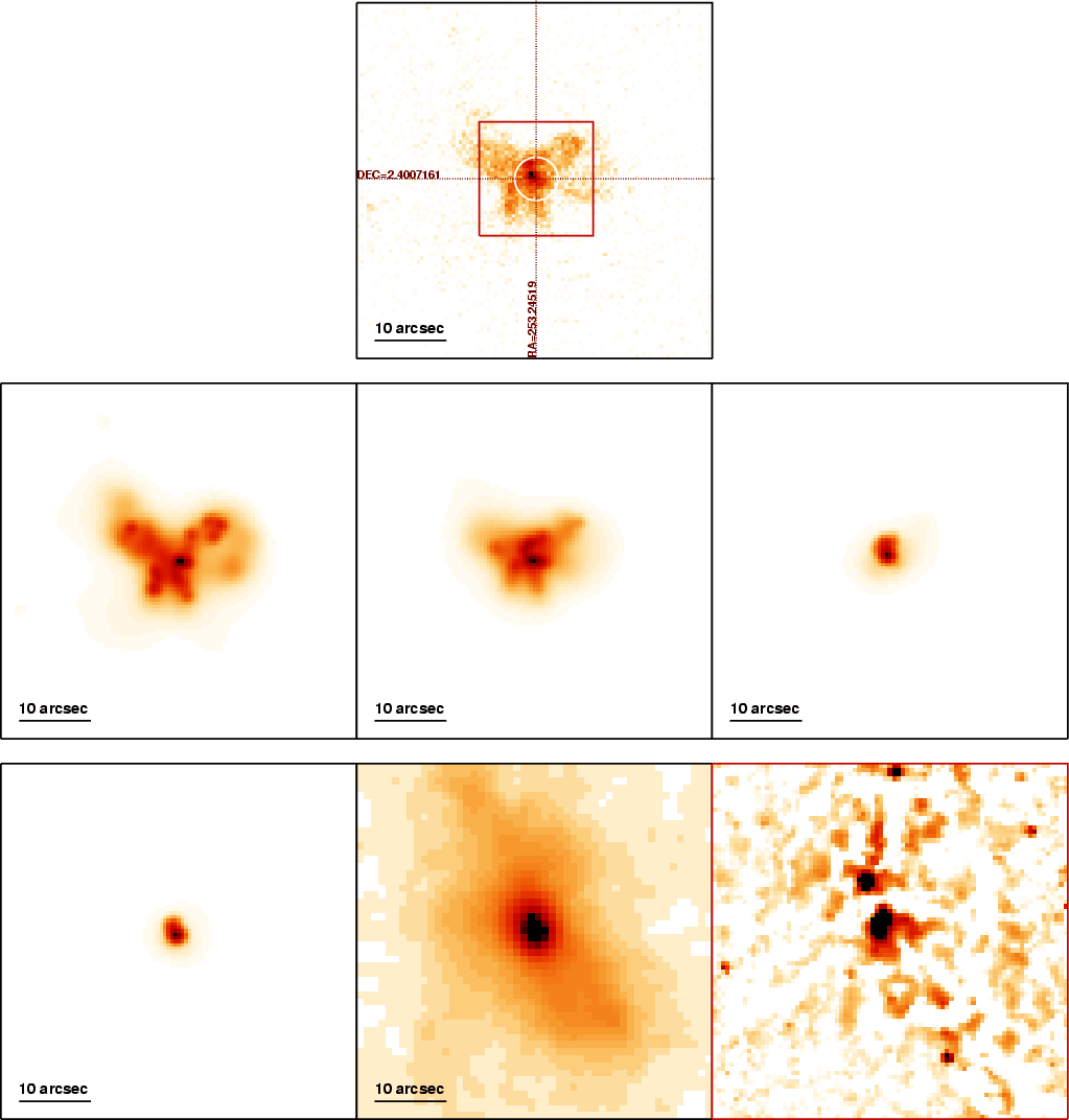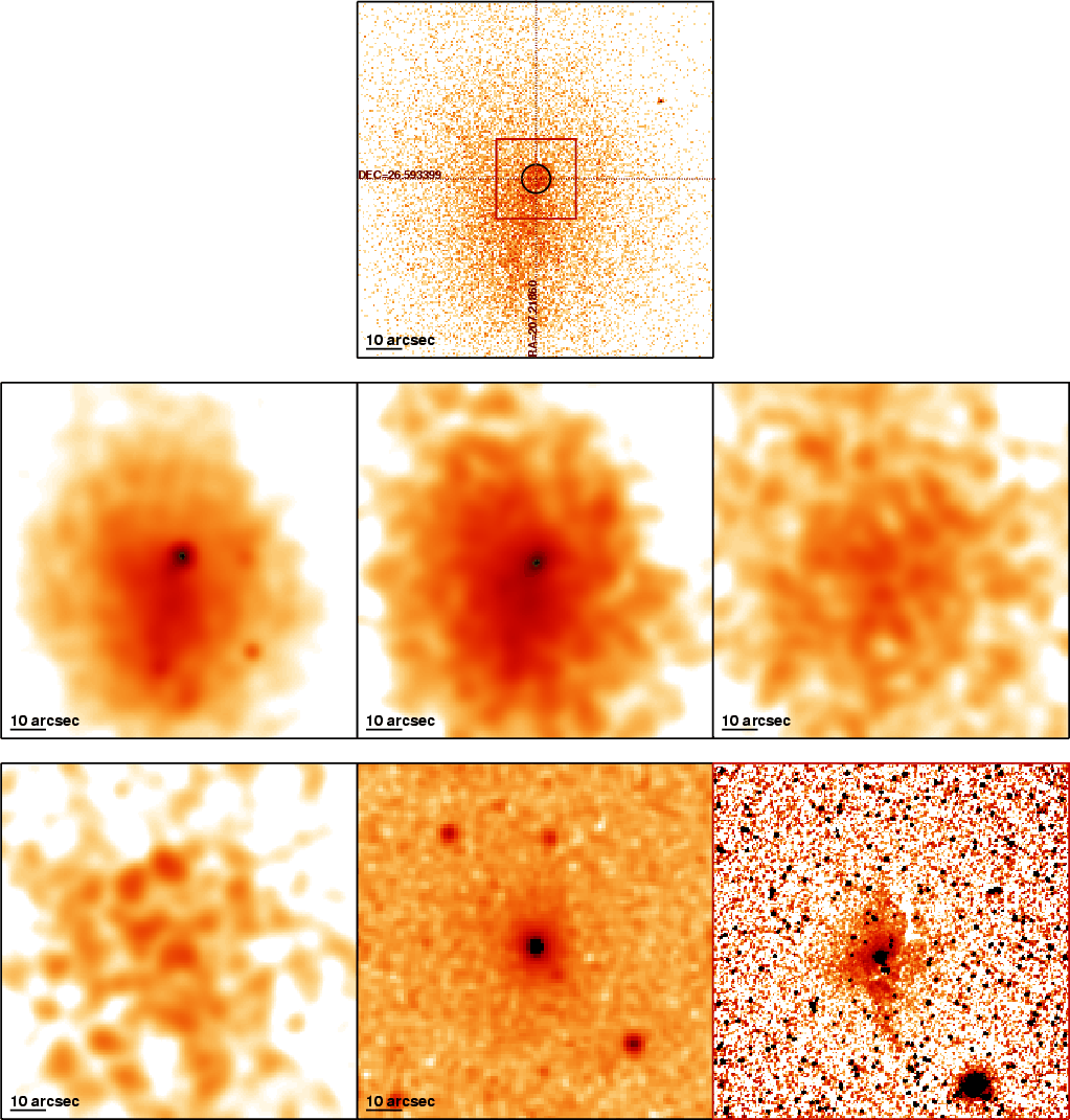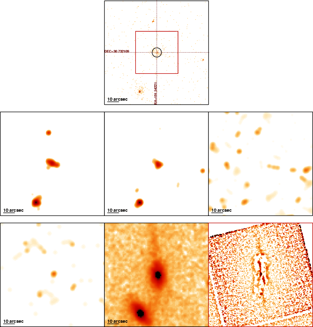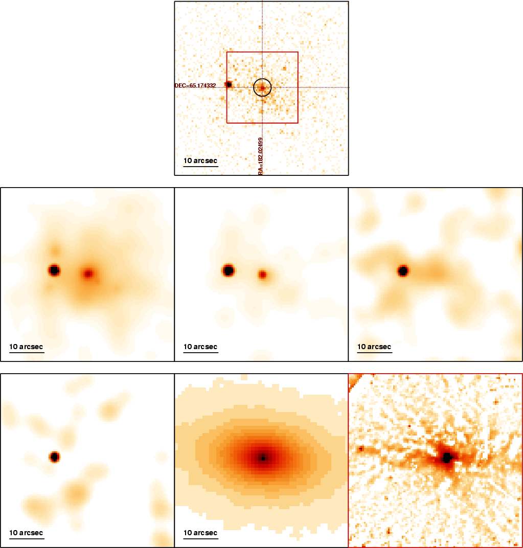 NGC 7130 (IC 5135). This galaxy shows a well-defined nuclear source at high X-ray energies (Fig. 5). Since most of the UV emission is spectrally characteristic of star formation (Thuan 1984; Gonzalez-Delgado et al. 1998), Levenson et al. (2005) tried to decompose the AGN and Starburst contributions and find that the AGN contribution manifested mainly at higher energies, higher than 3 keV. They find that the obscuration of the nucleus is Compton-thick, which prevents the detection of the intrinsic emission in the Chandra bandpass below 8 keV. We recall that our spectral fitting is not statistically acceptable for this source.