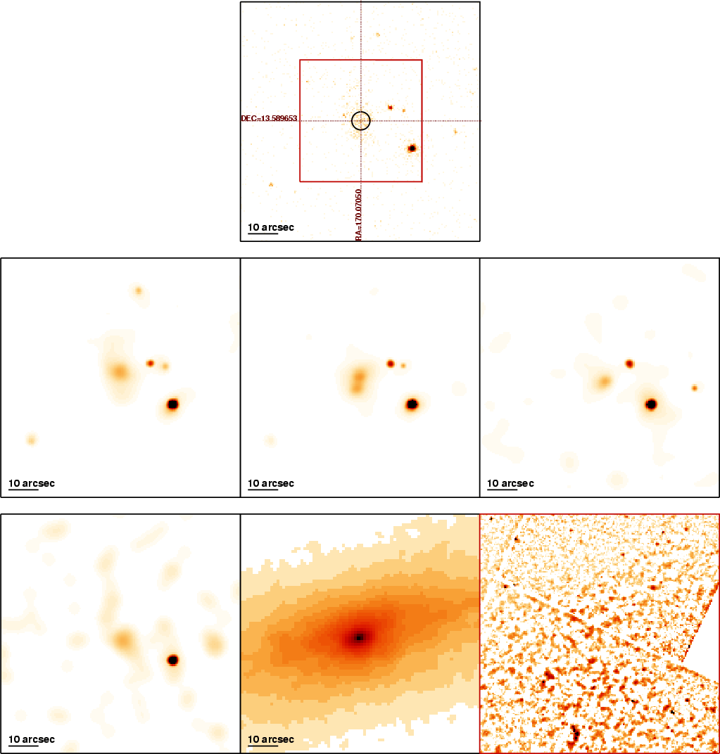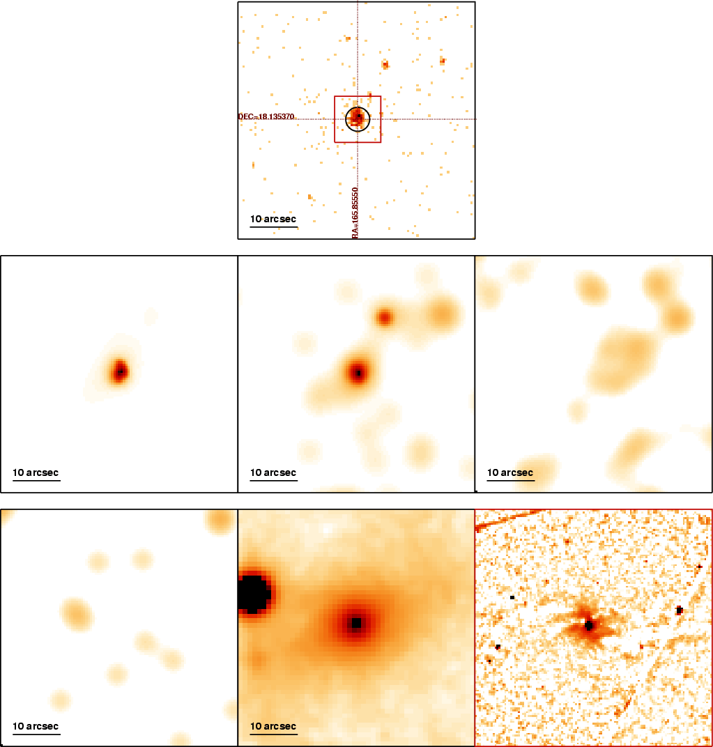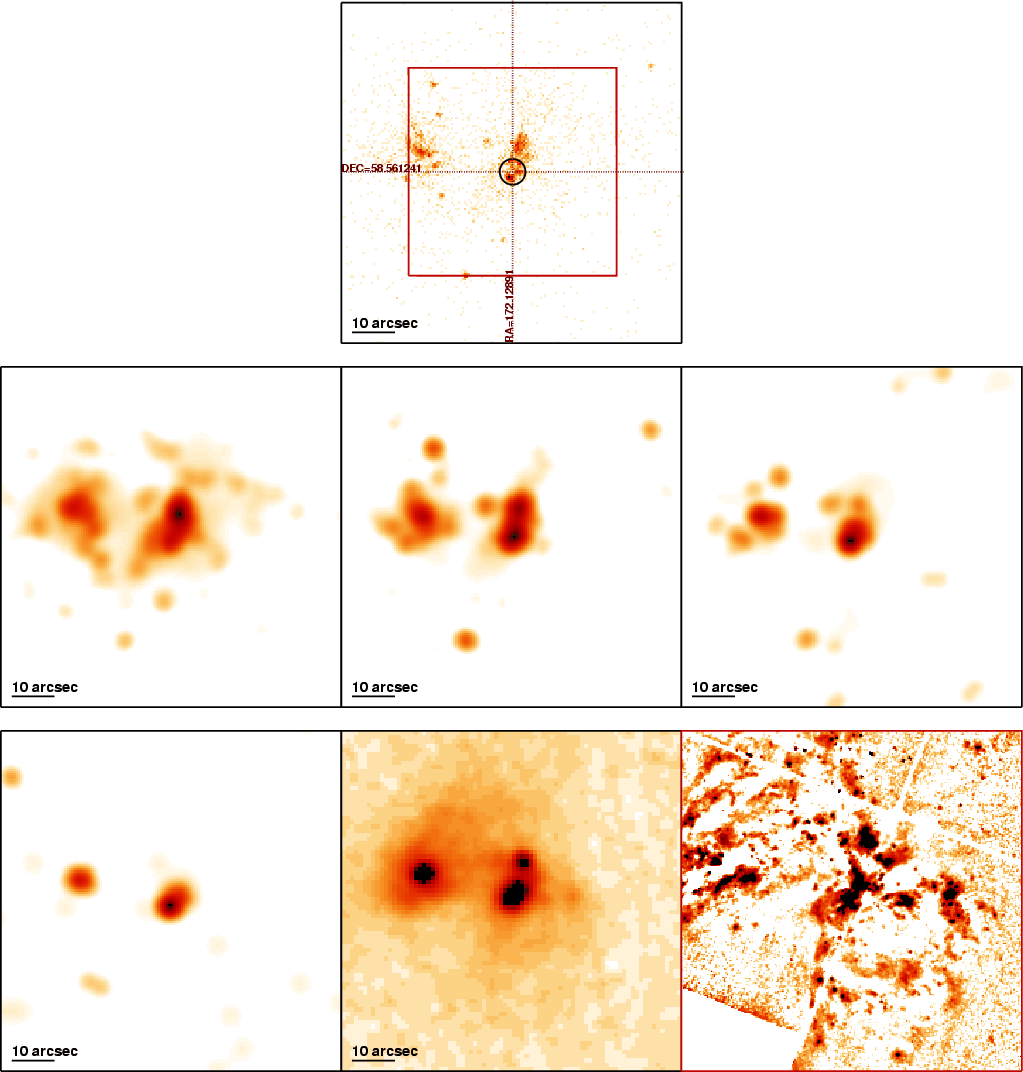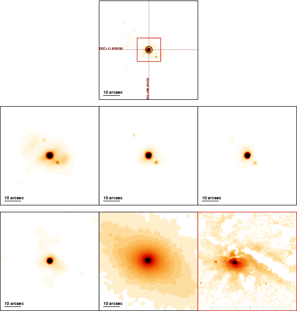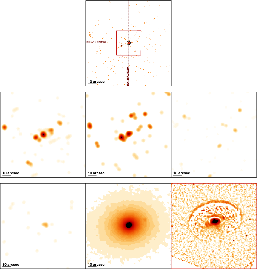 NGC 7130 (IC 5135). This galaxy shows a well-defined nuclear source at high X-ray energies (Fig. 5). Since most of the UV emission is spectrally characteristic of star formation (Thuan 1984; Gonzalez-Delgado et al. 1998), Levenson et al. (2005) tried to decompose the AGN and Starburst contributions and find that the AGN contribution manifested mainly at higher energies, higher than 3 keV. They find that the obscuration of the nucleus is Compton-thick, which prevents the detection of the intrinsic emission in the Chandra bandpass below 8 keV. We recall that our spectral fitting is not statistically acceptable for this source.