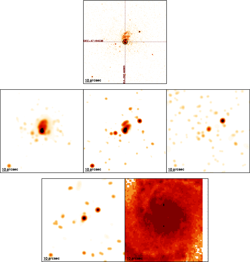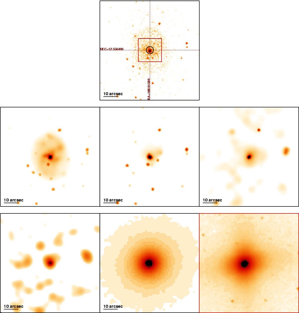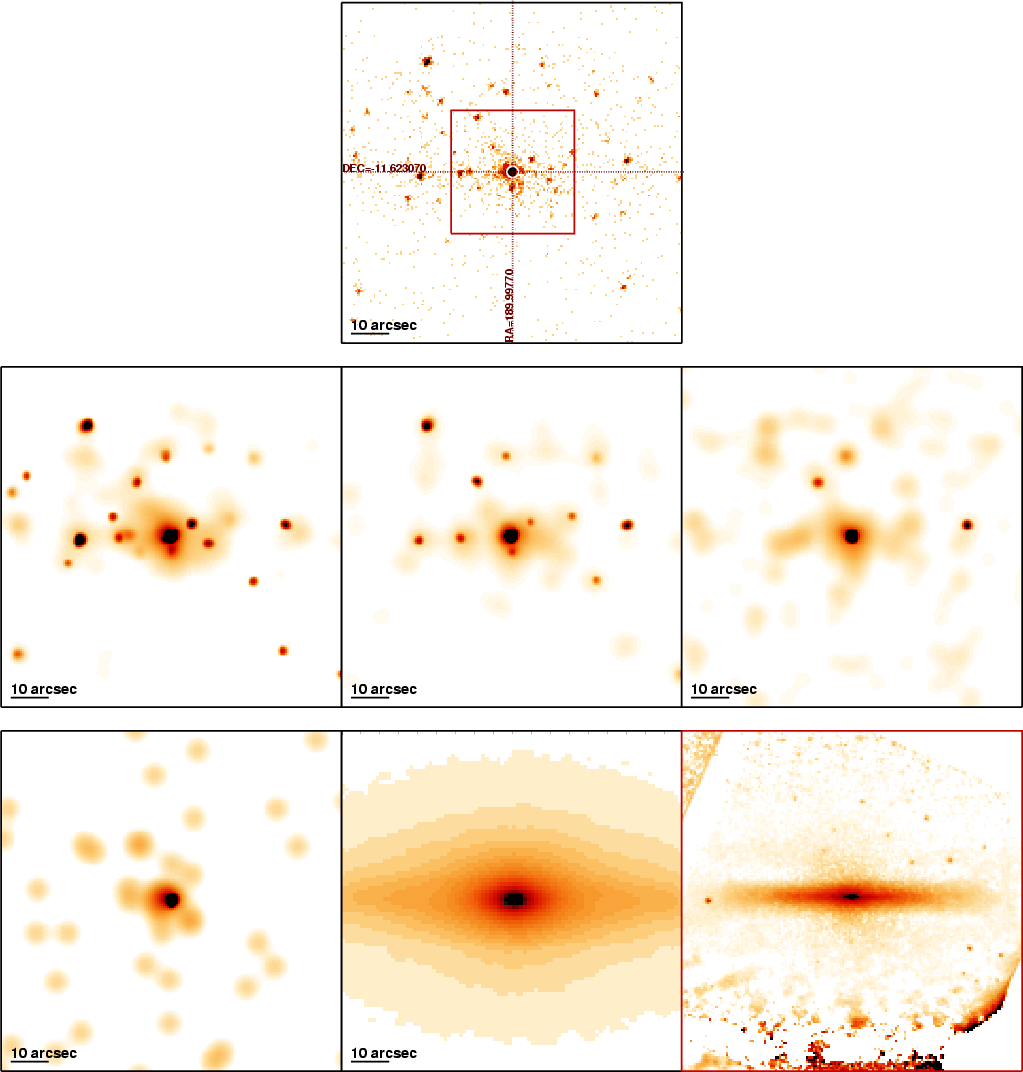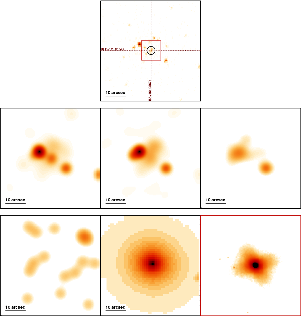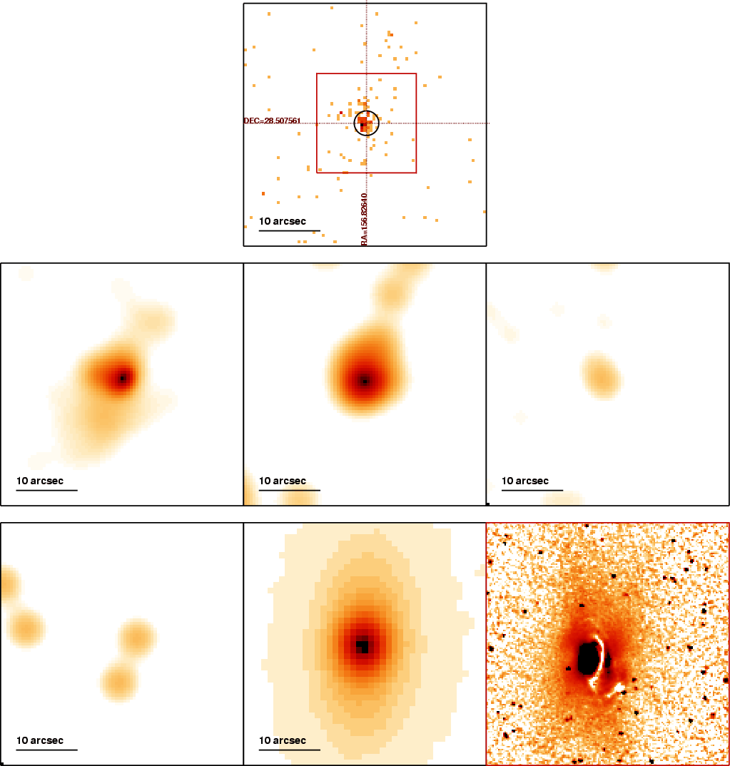 NGC 7130 (IC 5135). This galaxy shows a well-defined nuclear source at high X-ray energies (Fig. 5). Since most of the UV emission is spectrally characteristic of star formation (Thuan 1984; Gonzalez-Delgado et al. 1998), Levenson et al. (2005) tried to decompose the AGN and Starburst contributions and find that the AGN contribution manifested mainly at higher energies, higher than 3 keV. They find that the obscuration of the nucleus is Compton-thick, which prevents the detection of the intrinsic emission in the Chandra bandpass below 8 keV. We recall that our spectral fitting is not statistically acceptable for this source.