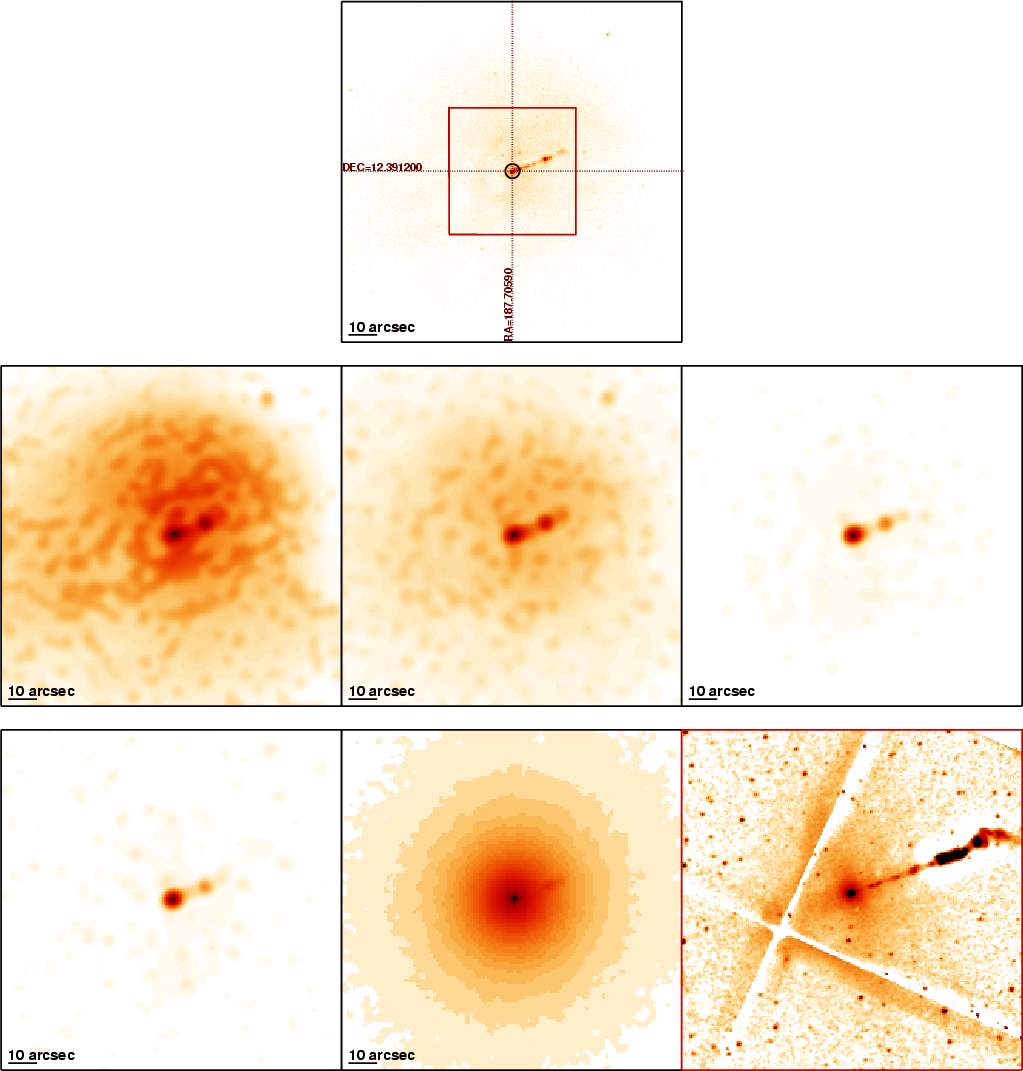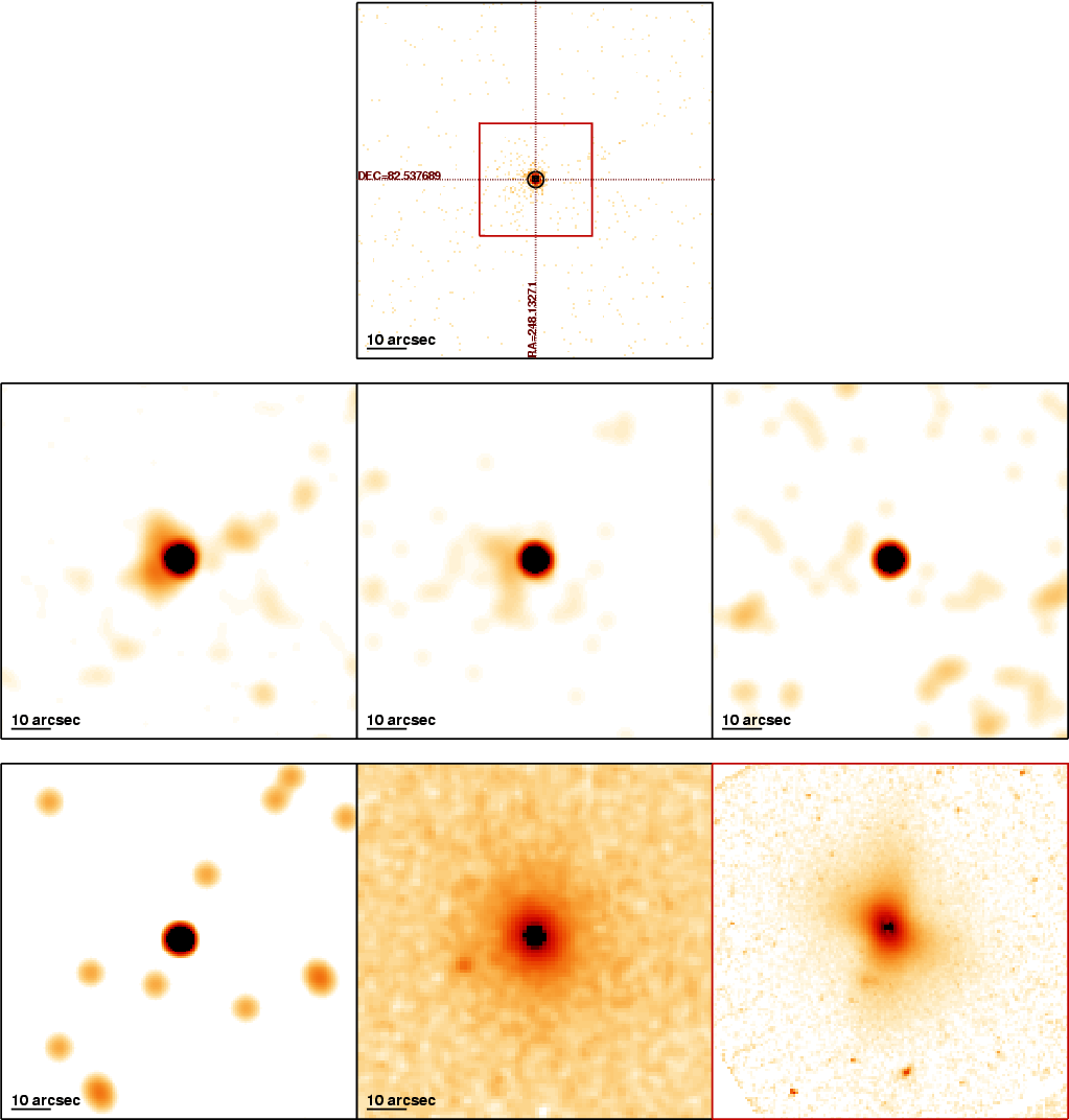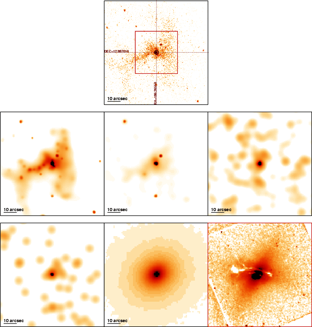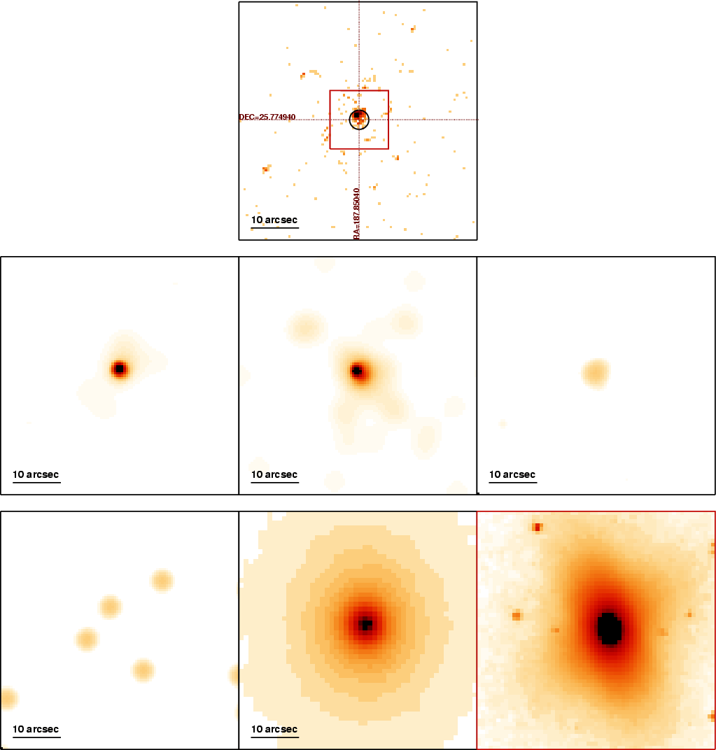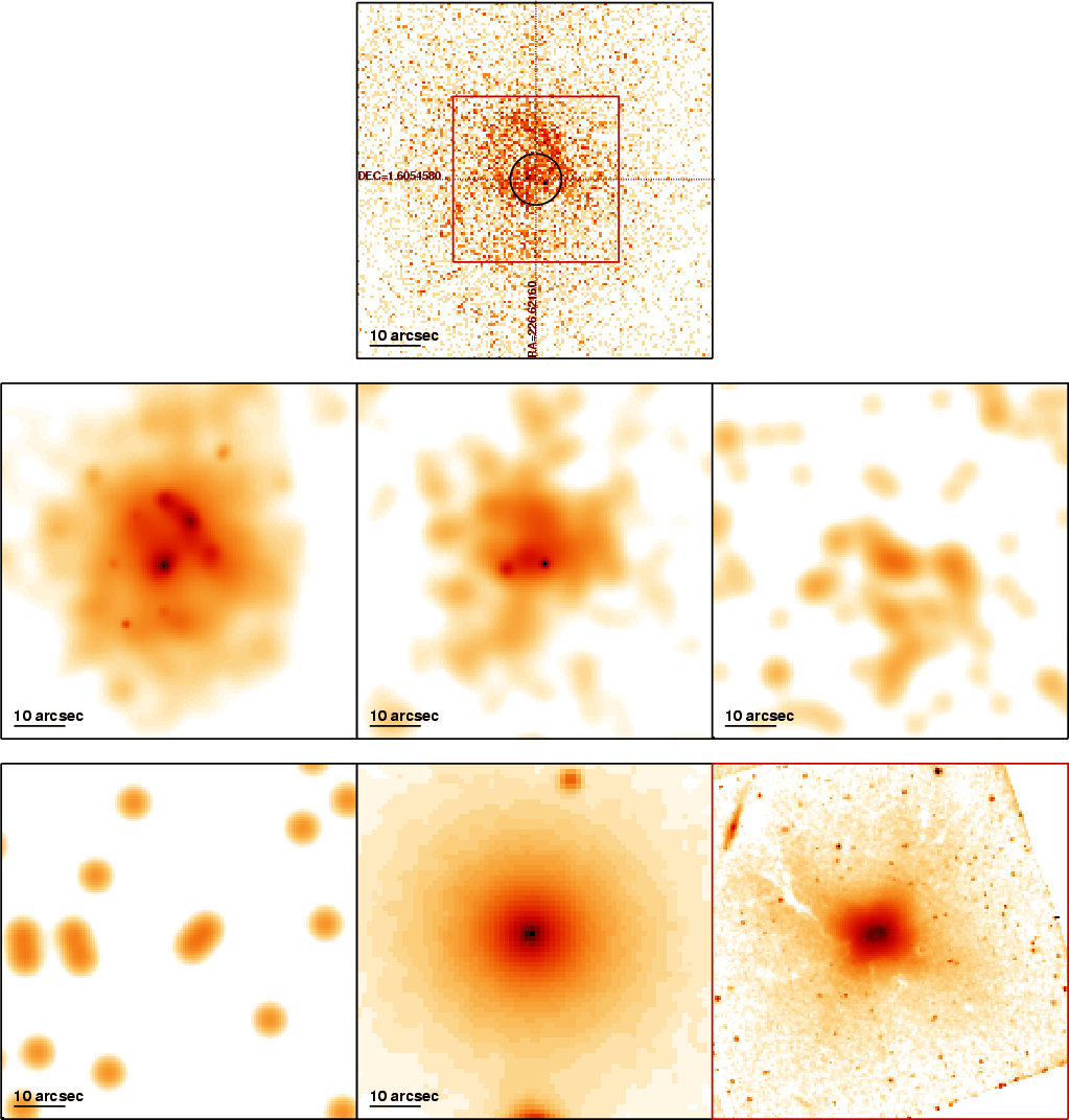 NGC 7130 (IC 5135). This galaxy shows a well-defined nuclear source at high X-ray energies (Fig. 5). Since most of the UV emission is spectrally characteristic of star formation (Thuan 1984; Gonzalez-Delgado et al. 1998), Levenson et al. (2005) tried to decompose the AGN and Starburst contributions and find that the AGN contribution manifested mainly at higher energies, higher than 3 keV. They find that the obscuration of the nucleus is Compton-thick, which prevents the detection of the intrinsic emission in the Chandra bandpass below 8 keV. We recall that our spectral fitting is not statistically acceptable for this source.