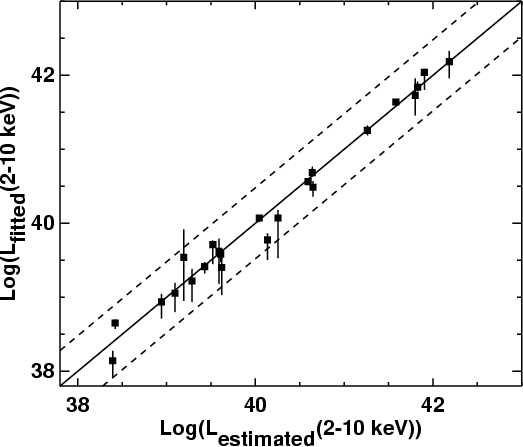 The estimation of the luminosity by Satyapal et al. (2004) for an intrinsic power slope of 1.8 is in perfect agreement