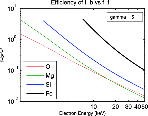 Figure A.1: The f-b electron efficiency compared to f-f for the 4 elements discussed in Appendix A. It is evident from the graph that, if present, highly ionised Fe is the most efficient source of f-b HXRs in terms of the F(E) needed followed by Si, O and Mg. |