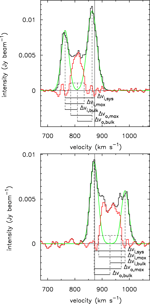 Table B.1: Velocities and masses of gas detected at ``anomalous'' velocities as derived from fitting a double-Gaussian to several profiles of the data cube.