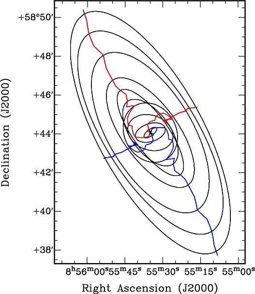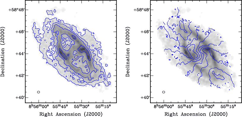 Total-intensity map ( left) and first-moment velocity field ( right) derive from the high-resolution data cube overlaid on a total intensity grey-scale map. The ellipse in the lower left corner represents the clean beam. The contours represent the