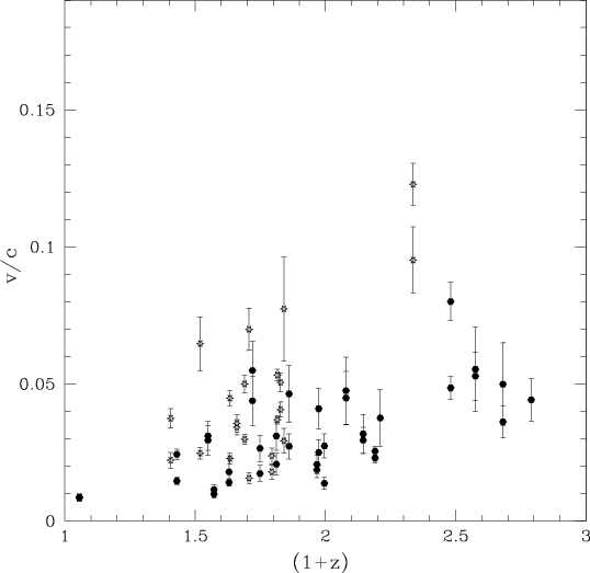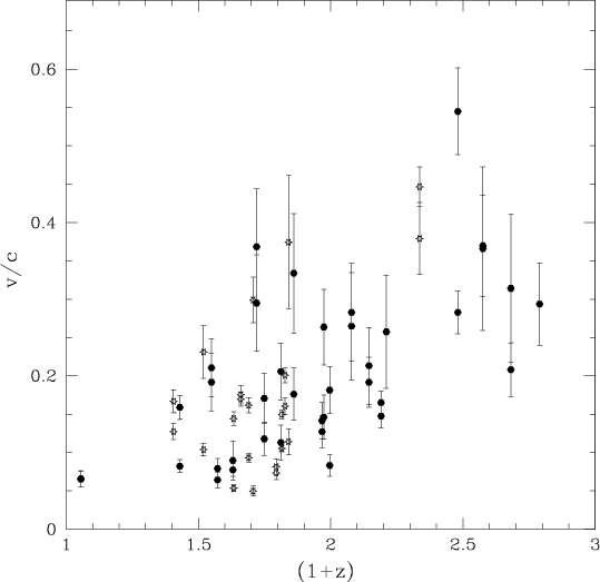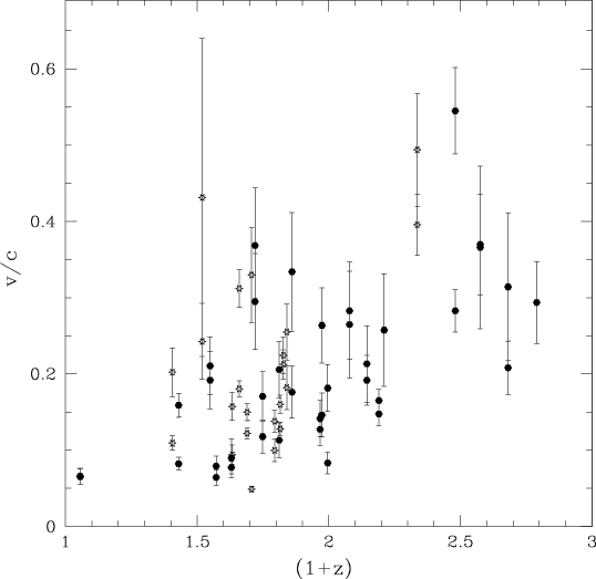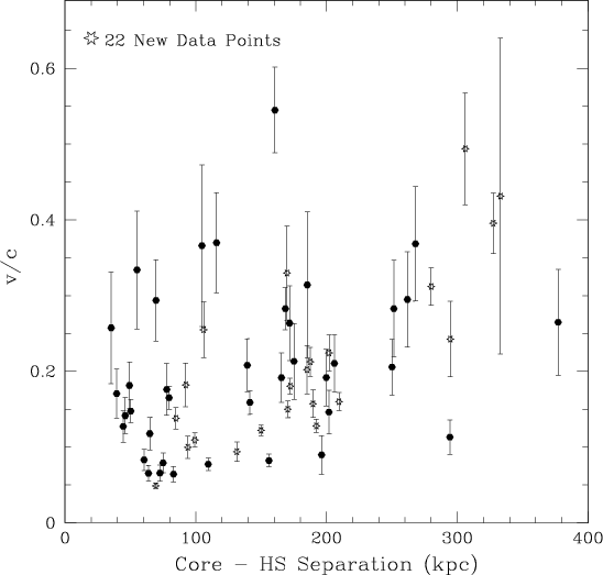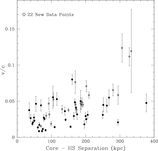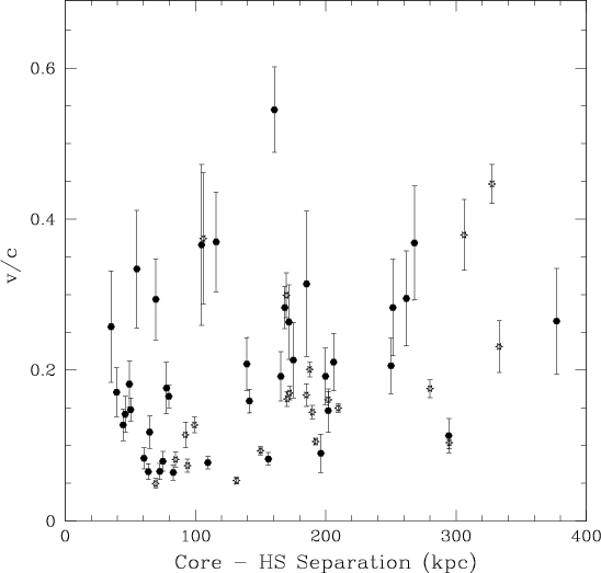 In this study, radio galaxies are considered so as to minimize projection effects. If the sources are not in the plane of the sky, our estimated velocities will be lower limits to the true velocity, e.g., a source which is oriented 30 degrees from the plane of the sky will have a velocity 15% larger than our estimate. Projection effects were studied in detail by Wan & Daly (1998), and are found to be quite small for the quantities studied here except when the outflow axis of the source is quite close to the line of sight of the observer.