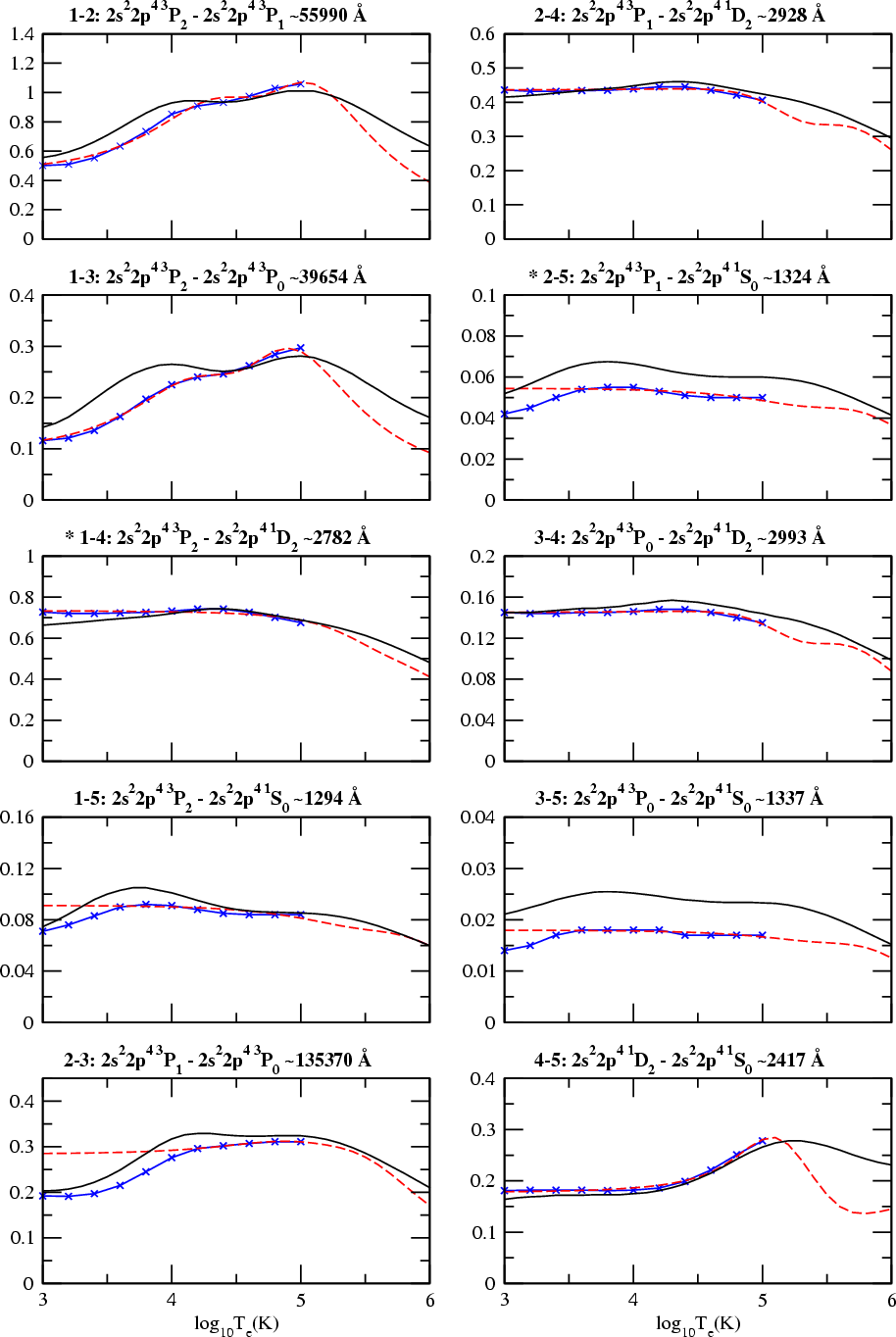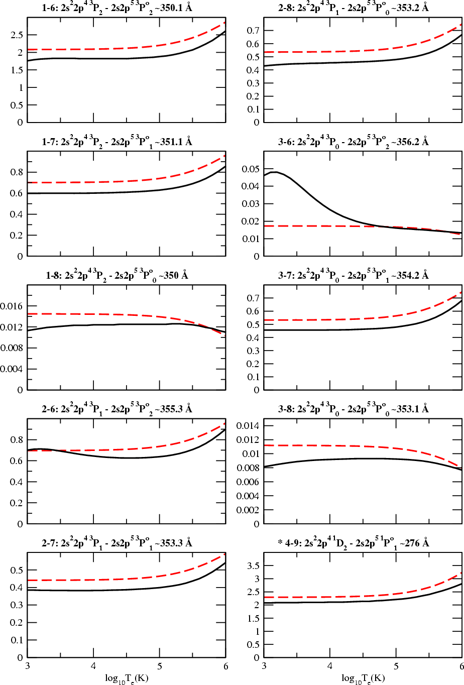 for 10 of these transitions, namely those between the first 5 J-levels arising from the first 3 LS targets - the 2p4 ground configurations. The data are given for a range of electron temperatures [