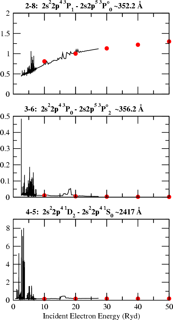 As a sample of the detail obtained from the current work and an indication of what may cause the differences in the effective collision strengths between the current work and the Distorted wave calculation, Fig. 3 shows collision strengths for three of the transitions given in Fig. 2. These are: transitions 2-8, 3-6 and 4-5 (i.e. 2s22p4 3P1-2s2p5 3P