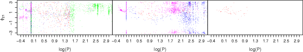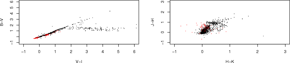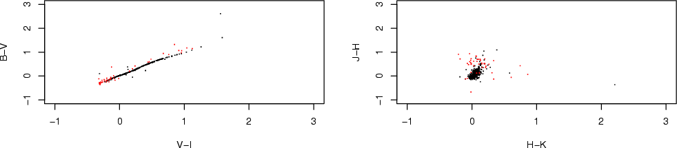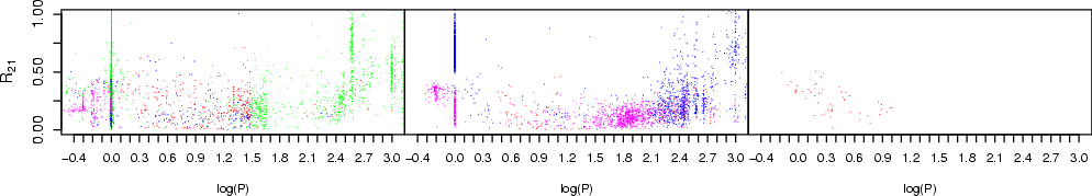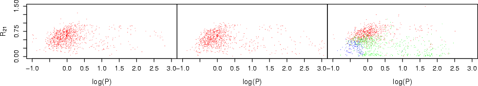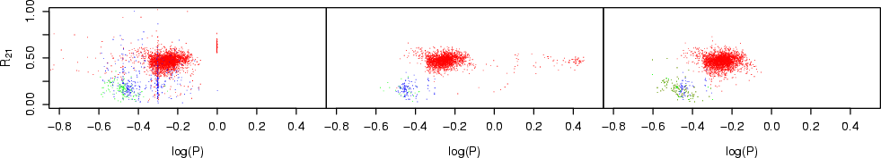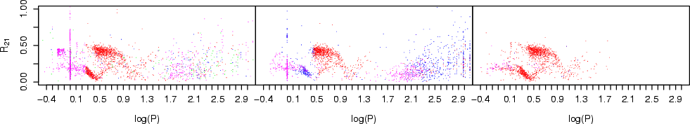 The classifiers presented in Paper I and the colour extensions presented here and discussed below were applied to the OGLE LMC/SMC (Zebrun et al. 2001) and Galactic Bulge (Wozniak et al. 2002) catalogues as downloaded from http://bulge.astro.princeton.edu/~ogle/ogle2/dia/ and ftp://bulge.princeton.edu/~ogle/ogle2/bulge_dia_variables respectively. Again, these catalogues contain duplicate entries that we kept for the same reasons as above. According to Eyer (2002) and Eyer & Wozniak (2001), the catalogues include spurious detections of variable objects. In Eyer (2002), these spurious detections are discussed and several systematic effects identified (chip perturbations, mirror realuminization and proximity to bright objects). In Eyer & Wozniak (2001), the authors discover a type of artifact introduced by the difference image analyses (DIA) consisting of the occurrence of pairs of monotonic anti-correlated light curves as a result of the presence of high proper motion stars in dense fields. The impact of these artifacts is restricted to the Bulge fields and, since i) they do not result in periodic signals and ii) systematic trends are removed from the fits to the data (see Paper I), we do not expect them to affect our results significantly.