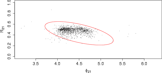 Alard (1996). The ellipse is centered on (4.5 rad, 0.43) with