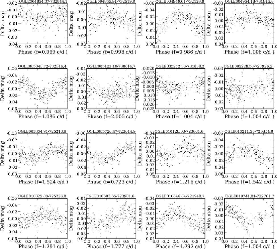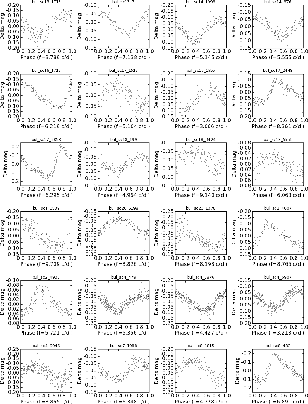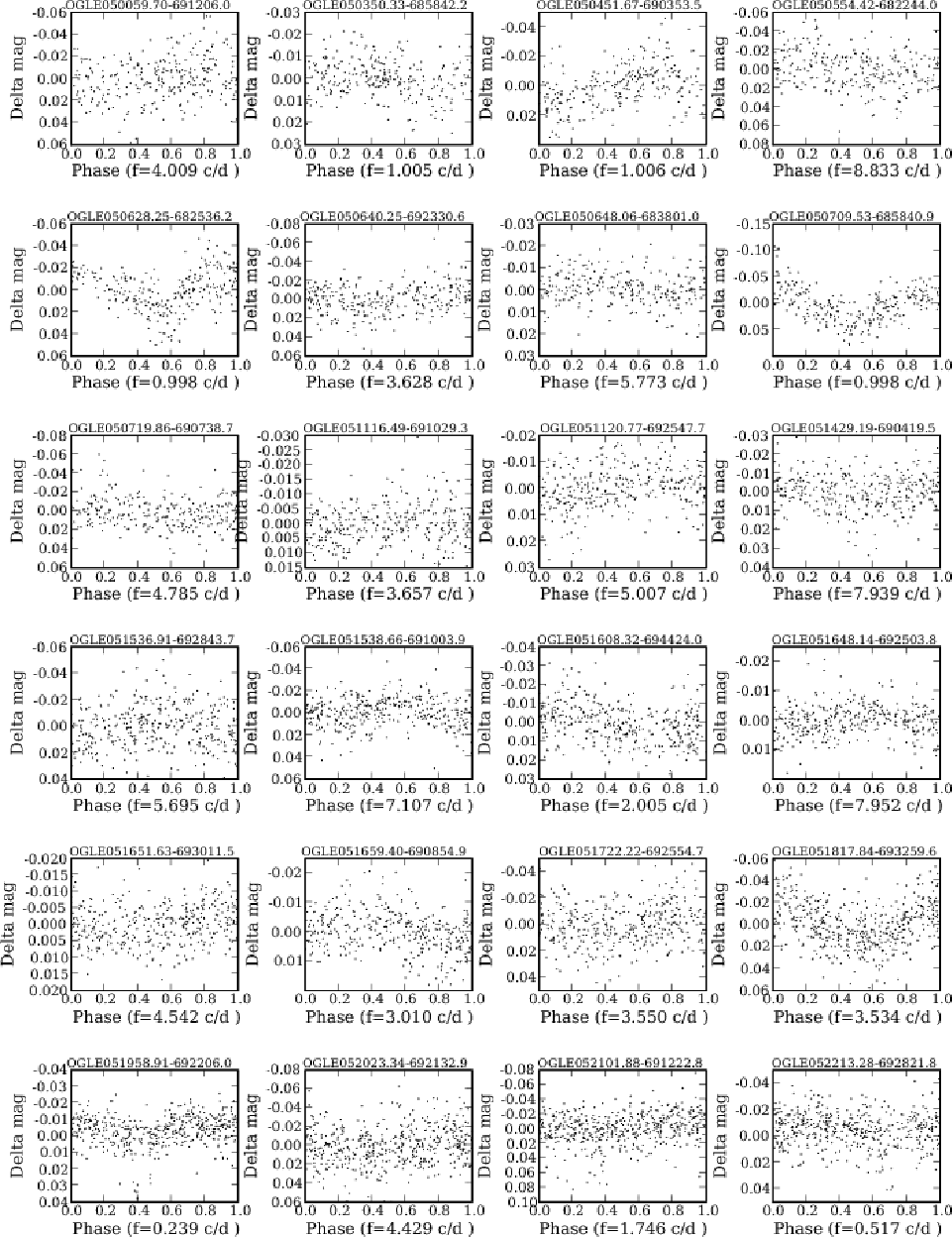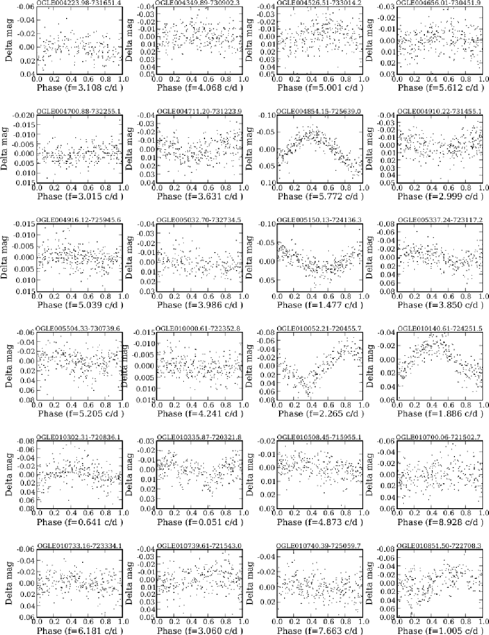 Here, we present a selection of Bulge objects classified as DSCUT, BCEP, SPB or GDOR, with the GM classifier, and not present in the respective combination lists made by Pigulski. These objects all have a respective class probability above 0.8 and a Mahalanobis distance to the class center below 2.7. Figures 30 to 34 show their phase plots made with f1. The OGLE Bulge identifiers are shown, and the values of f1 in cycles per day. Light curve parameters and V-I colour indices are listed in Tables 15 to 18. The most obvious spurious detections (having a value of f1 very close to 1 c/d) were removed from our selections. We stress that these are candidate lists obtained with probabilistic class assignments. Further investigation is needed to reach more certainty about the true nature of those objects. Significant overlap is present between the pulsation properties of the GDOR/SPB and BCEP/DSCUT classes, which is the reason why Pigulski did not make the distinction in his lists. We expect this to be reflected in our candidate lists as well, e.g. some SPB candidates might be GDORs and vice versa, and the same for the BCEP/DSCUT classes. Apart from some inherent overlap between these classes, this is mainly a limitation of the current classification attributes that we can use (e.g. the absence of a good colour), and the quality of the light curves.