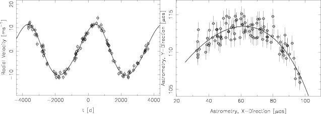 Figure 3: Simulated RV and astrometric measurements and the maximum a posteriori orbit. |