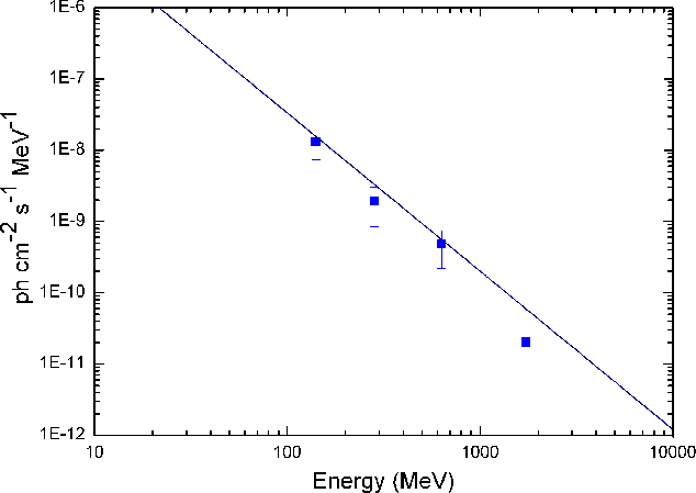 400-1000 MeV, 1000-3000 MeV. The solid line corresponds to a power law function with photon index 2.22 |