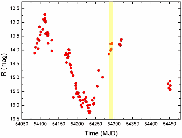 Figure 3: Long-term R-band light curve as observed by REM between December 2006 and December 2007. The yellow shaded region indicates the period covered by the GRID observation. |