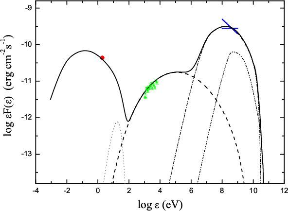 Figure 4: Spectral energy distribution of 3C 279 for the AGILE-GRID observation, including simultaneous optical (REM) and X-ray (Swift) data. The dotted, dashed, dot-dashed and double-dot dashed lines represent the contributions of the accretion disk blackbody, the SSC, the external Compton scattering of disk radiation and the external Compton scattering of radiation from clouds, respectively. |