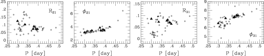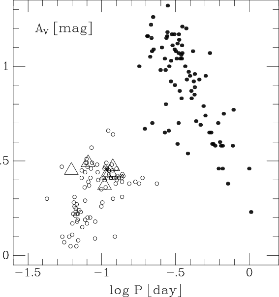 2005). Six double mode variables discussed in the previous section are displayed with filled triangles. Because they are strongly dominated by the first overtone, we will compare them with the