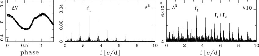 where the primary pulsation frequency f0 = 1/P0was also optimized in the fitting process. The fit Eq. (1) was then subtracted from the data and the residuals were searched for secondary periodicities. This was done with the Fourier power spectrum computed over the range of 0-10 c/d. If any additional signal was detected, a new Fourier fit with all frequencies identified so far and with their linear combinations was performed. All frequencies were optimized anew. The new fit was subtracted from the original time-series data and the residuals were searched again for additional periodicities. The process was repeated until no new frequencies appeared. At this stage we performed data clipping, by rejecting all measurements deviating from the fit by more than 5
