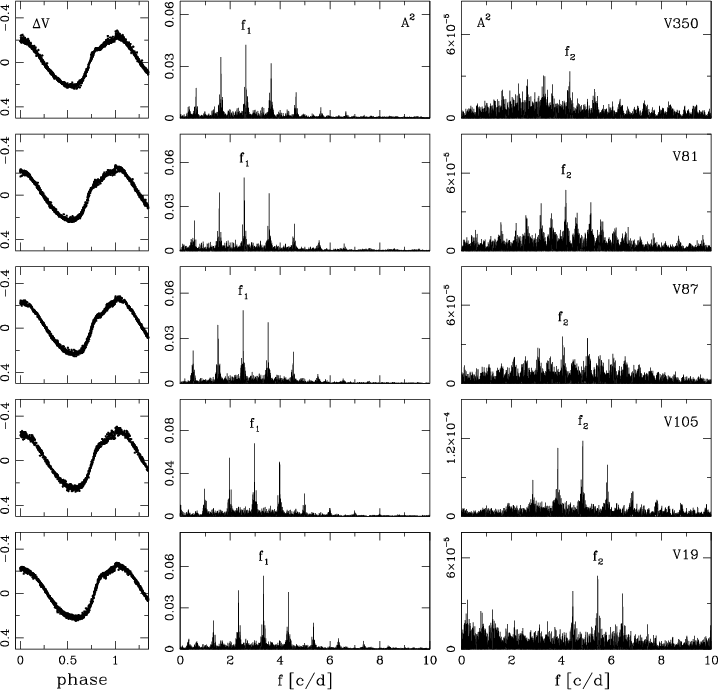 Figure 2: Same as Fig. 1, but for double mode RR Lyr variables V350, V81, V87, V105 and V19. |