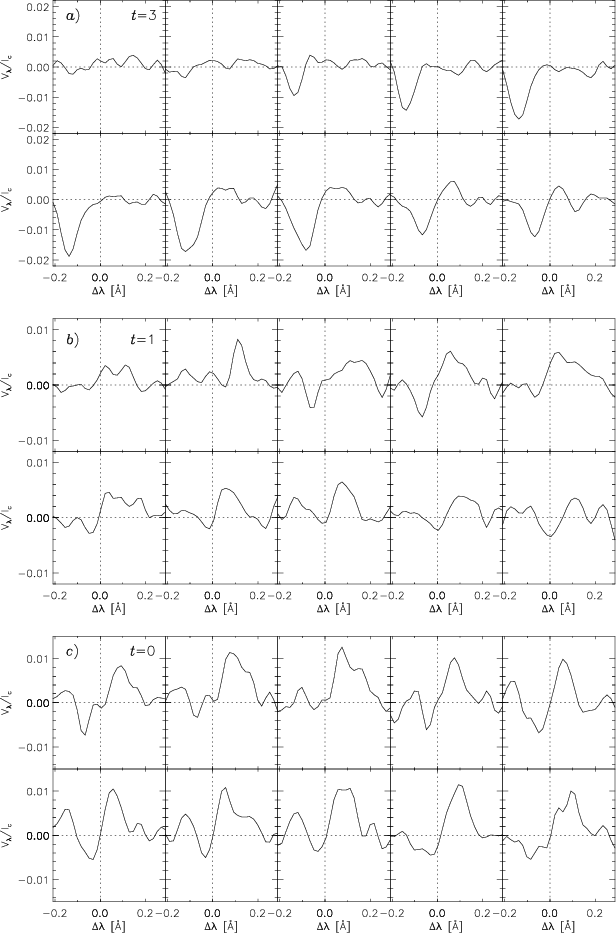 from the Doppler shift of the fitted parabola. Furthermore, the centre-of-gravity (COG) of the I profiles gives another measurement of the velocity. We calculated the wavelength positions of the COG of profiles with three limits of upper intensity