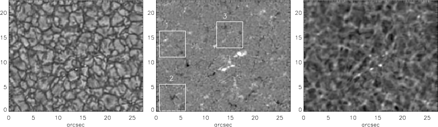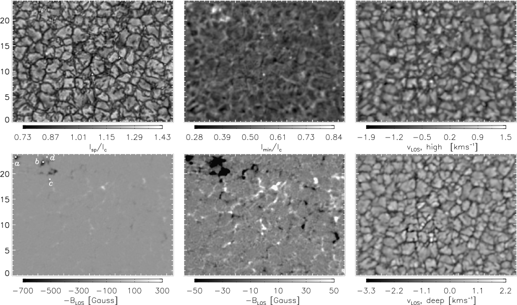 In the present study, we concentrate on the Stokes I and V signals. The degree of linear polarisation from weak fields of the Sun is low for Fe I 6173 and the signals require a special analysis, as demonstrated by Lites et al. (2008). The analysis of the linear polarisation signals and the discussion of horizontal magnetic field components are certainly important for understanding the IN magnetic fields (e.g. Steiner et al. 2008; Lites et al. 2008; Abbett 2007; De Pontieu 2002; Martínez González et al. 2007b; Lites et al. 1996; Martínez González et al. 2007a; Centeno et al. 2007). Here, we restrict the analysis to circular polarisation and defer the investigation of the measured Stokes Q and U profiles to future work.
