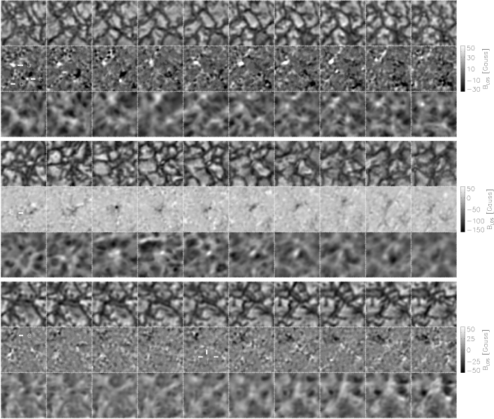 - The full time sequence, containing the original and degraded simulated continuum intensities, line minimum intensities, magnetograms, and Dopplergrams, is available as a gif movie as online material.