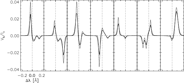 profiles (Semel 1967; Rees & Semel 1979). According to these authors, this yields the line-of-sight (LOS) components of the magnetic fields averaged over the resolution element and over the formation height, and reduced by spurious light from scattering in Earth's atmosphere and by the telescope optics. We denote this as