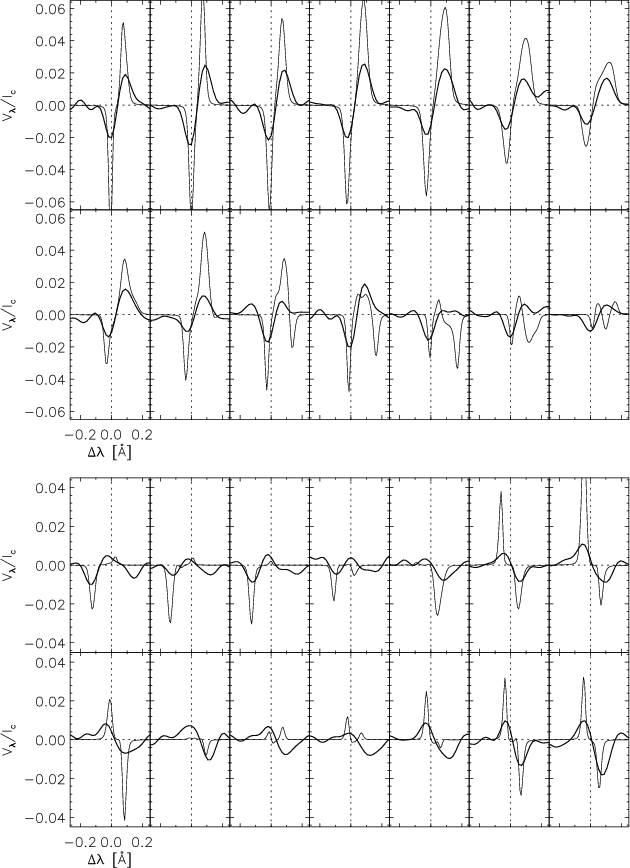 The zero position in the wavelength axes of the V profiles presented below are shifted by +8.6 mÅ relative to the COG position of the average I profiles in the FOVs (from disc centre). This corresponds to the convective blueshift of the average I profile due to granular motion (Schröter 1957). As will be shown and discussed below, the V profiles become very asymmetric at high spatial resolution in both the observations and the simulations. Sometimes, only one V lobe is present, sometimes two positive/negative lobes, strongly shifted in wavelength (see also Sigwarth et al. 1999). We thus refrain from trying inversions of such profiles. We do not feel confident that a Milne-Eddington inversion assuming magnetic field and velocity independent of height, or a two-component inversion with one magnetic and one non-magnetic component, will lead to realistic descriptions. Recent work by Socas-Navarro et al. (2008) has cast doubts on the reliability of inversions from line pair observations to determine the field strengths. We compare the observed profiles and the physical parameters derived from them with those from simulated model atmospheres.
