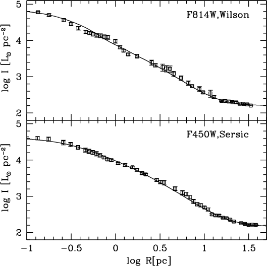 - The surface brightness profiles of these and other LMC clusters have been studied by Mackey & Gilmore (2003) who provide the parameters of the EFF87 models that best fit the observed profiles. To derive the reported half-light radii we searched for the King 1962 model providing the best match to the EFF87 best-fit profile found by Mackey & Gilmore (2003), and adopted the corresponding